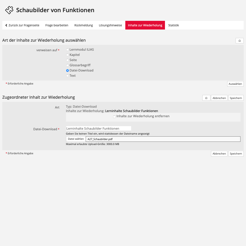 - In den Fragen werden "Inhalte zur Wiederholung" angegeben, z.B. als Datei-Download; in den Einstellungen wird definiert, dass diese den Studierenden angezeigt werden