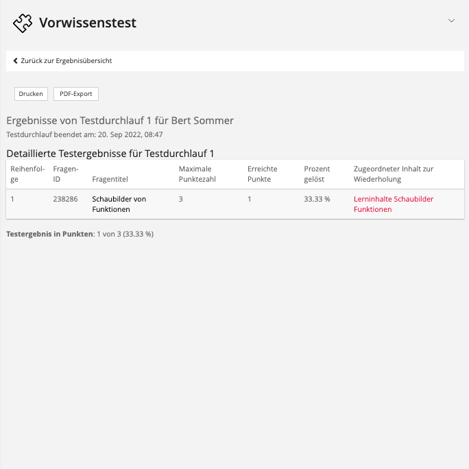 - Nach der Durchführung können die Studierenden ihre Testergebnisse und die vorgeschlagenen "Inhalte zur Wiederholung" einsehen