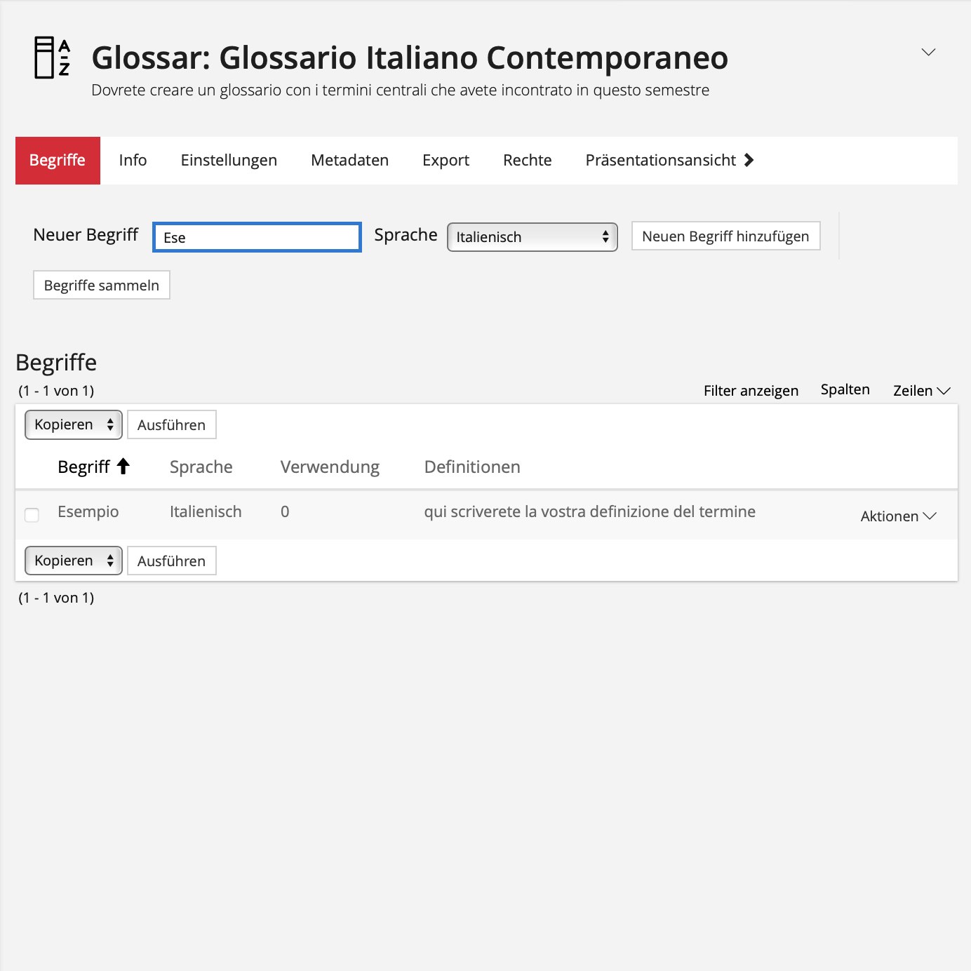 - Die Studierenden können dem Glossar Begriffe hinzufügen und diese definieren