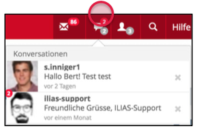 Über die Topbar gelangen Sie zum Menü «Konversationen». Sie sehen jeweils wie viele noch nicht gelesene Nachrichten Sie haben (Zahl oben) und in wie vielen Konversationen Sie aktuell teilnehmen (Zahl unten).