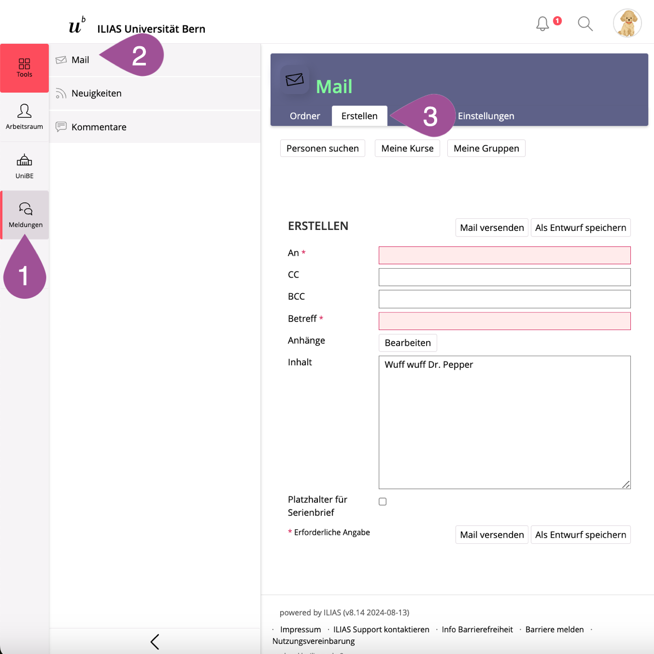 Mit Ihrem ILIAS Account haben Sie Zugriff auf das interne Mailsystem von ILIAS. Damit können Sie Emails innerhalb von ILIAS empfangen und an andere Personen senden, z.B. an Kursteilnehmende oder Gruppenmitglieder. Es können aber auch Emails an externe Email-Adressen wie beispielsweise muster@gmx.net gesendet werden.