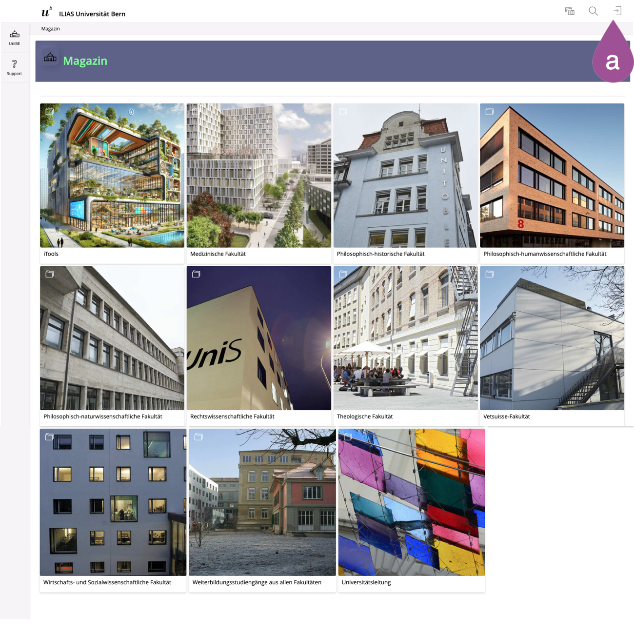 Das «Magazin» ist die erste Ebene der gesamten Struktur von ILIAS und enthält alle Inhalte der Plattform. Das Magazin kann als Startseite festegelegt werden (siehe 1.2 Account-Einstellungen) und über das Hauptmenü aufgerufen werden (UniBE > Einstiegsseite). | |