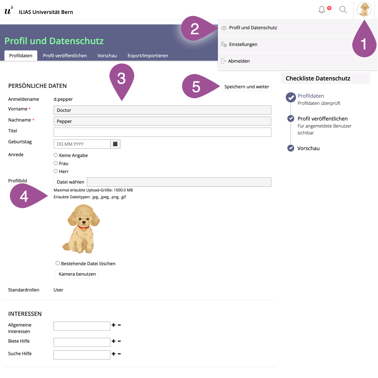 Unter «Profil und Datenschutz» finden Sie Ihren ILIAS Anmeldename und Sie können zu Ihrem Namen und Ihrer Email-Adresse, welche nicht veränderbar sind, zusätzliche Angaben zu Ihrer Person hinterlegen. Es empfiehlt sich zudem, Ihr Profil zu veröffentlichen, damit Andere (z.B. Kursmitglieder in der Mitgliedergalerie eines Kurses) Ihre Informationen und Kontaktdaten einsehen können.