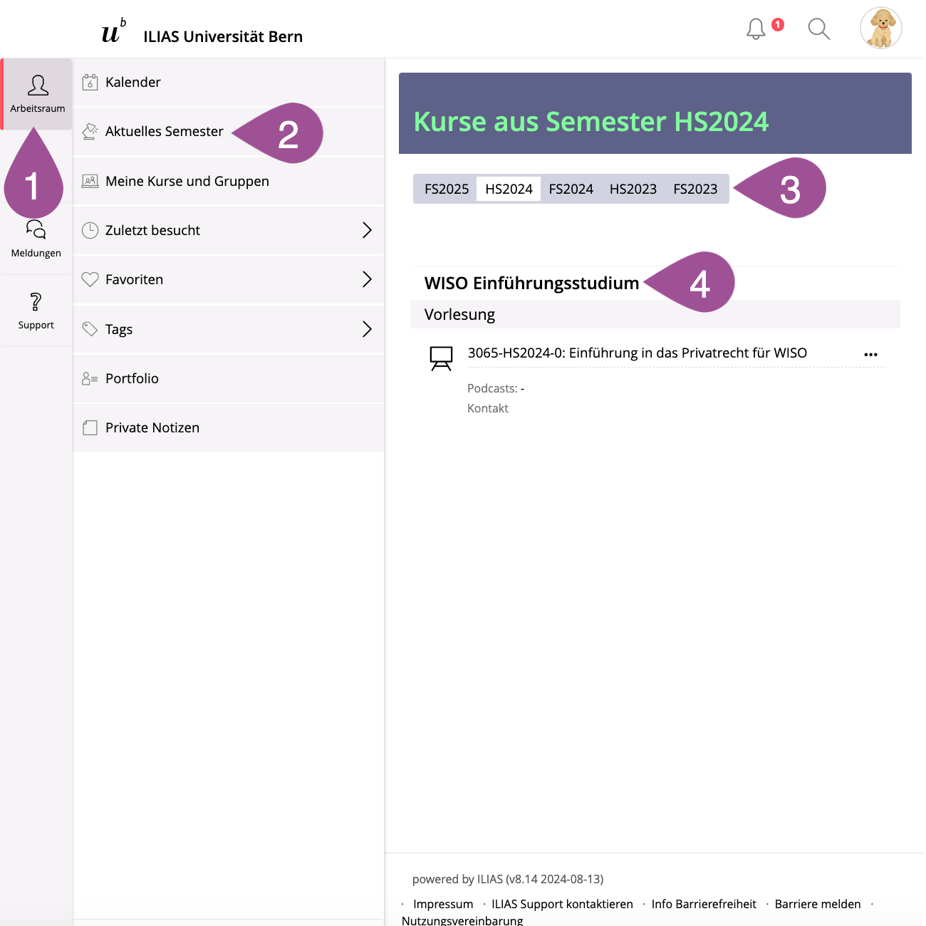 Nutzen Sie den Untermenüpunkt «Aktuelles Semester», um schnell zu Ihren Kursen im aktuellen Semester zu navigieren.