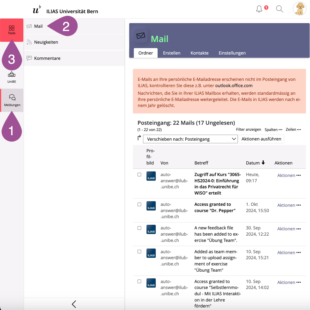 Bitte beachten Sie, dass Nachrichten, die Sie in Ihrer ILIAS Mailbox erhalten, standardmässig auch an Ihre Uni-Email-Adresse weitergeleitet werden. Sollte diese Weiterleitung nicht funktionieren, müssen Sie den ILIAS Absender im Outlook entblockieren. Emails, die direkt an Ihre Uni Email-Adresse geschickt wurden, erscheinen nicht im Email-Bereich von ILIAS.