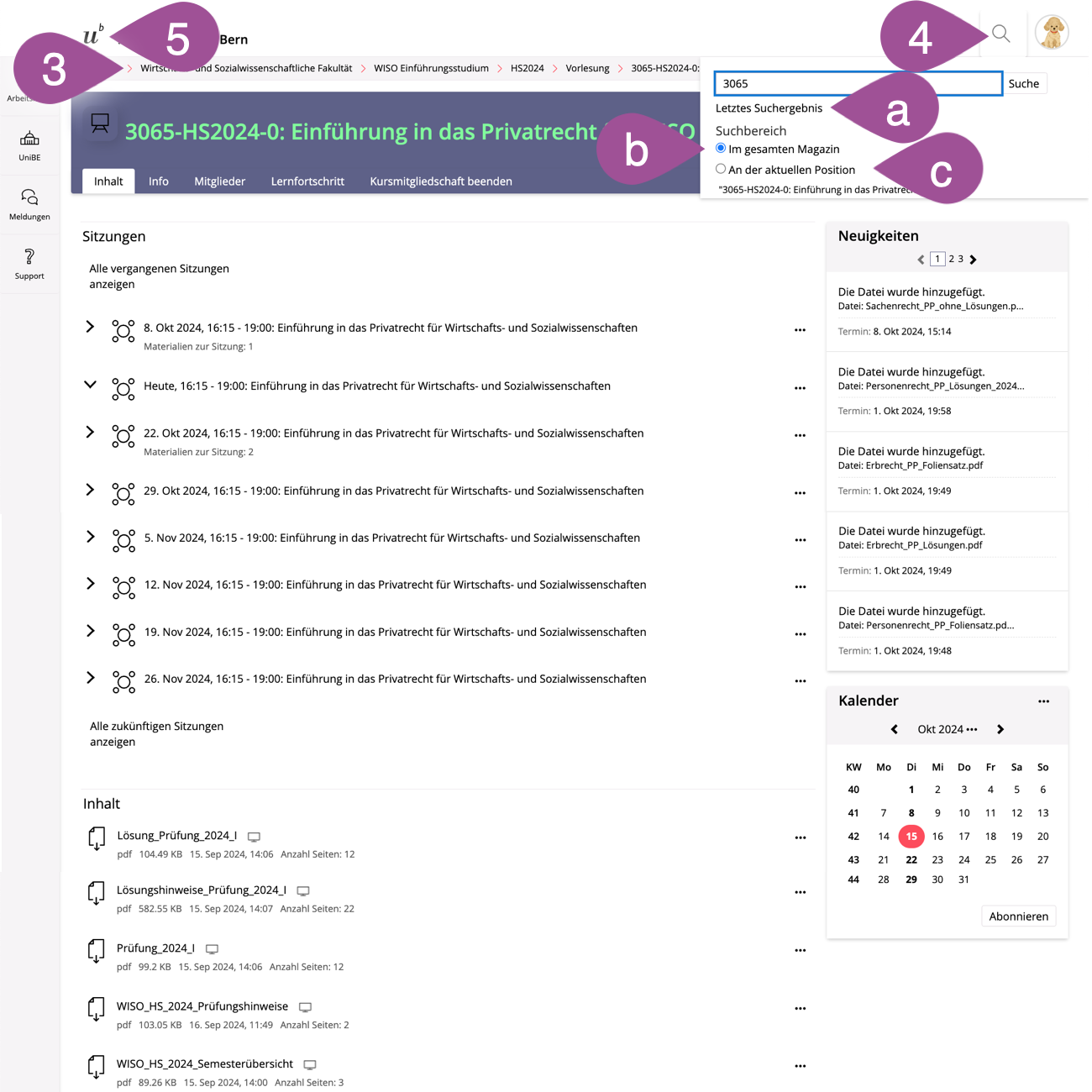 Vom «Magazin» aus können Sie alle Inhalte auf ILIAS aufrufen. Klicken Sie dazu zunächst auf die jeweilige Fakultät und arbeiten Sie sich zur gewünschten Veranstaltung durch. | |||||||