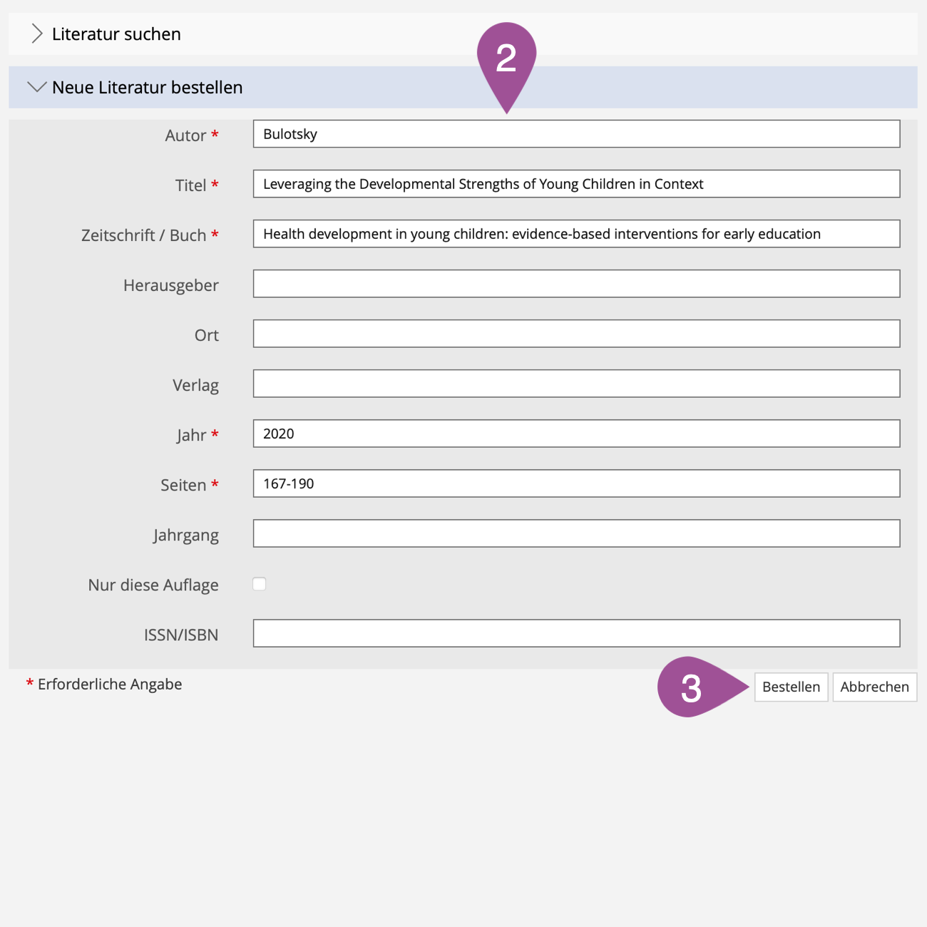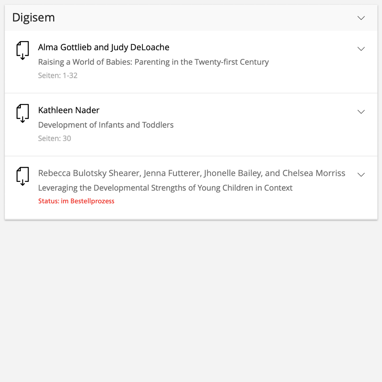 Werden keine Resultate zu Ihren Suchworten gefunden, ist die Literatur noch nicht in DigiSem vorhanden. Sie können eine Bestellung für die gewünschte Literatur aufgeben. Bitte beachten Sie, dass es bis zu vier Wochen dauern kann, bis die Literatur von der Universitätsbibliothek besorgt und im ILIAS-Kurs bereitgestellt werden kann.