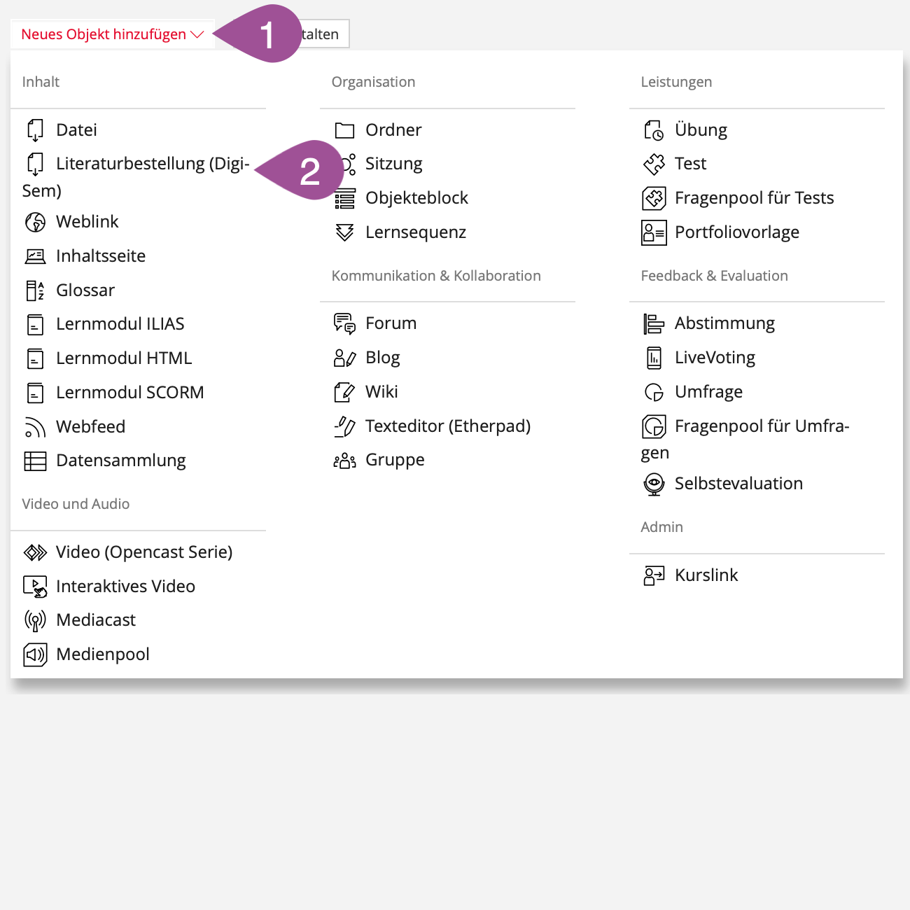 Sobald Sie sich in einem Kurs (oder Session, Ordner oder Gruppe) befinden und die entsprechenden Administratoren-Rechte besitzen, können Sie einen «DigiSem» anlegen. Gehen Sie dazu wie folgt vor: