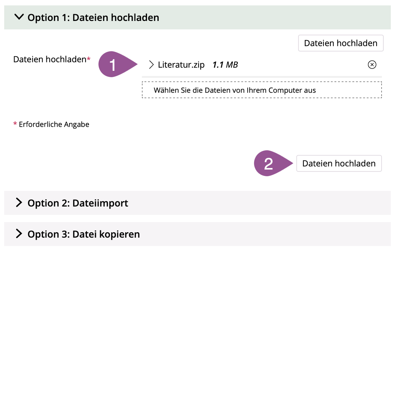 Ziehen Sie die entsprechende(n) Datei(en) per Drag-and-Drop in den umrahmten Bereich oder klicken Sie auf «Wählen Sie die Dateien von Ihrem Computer aus» und selektieren anschliessend die entsprechende(n) Datei(en). | |