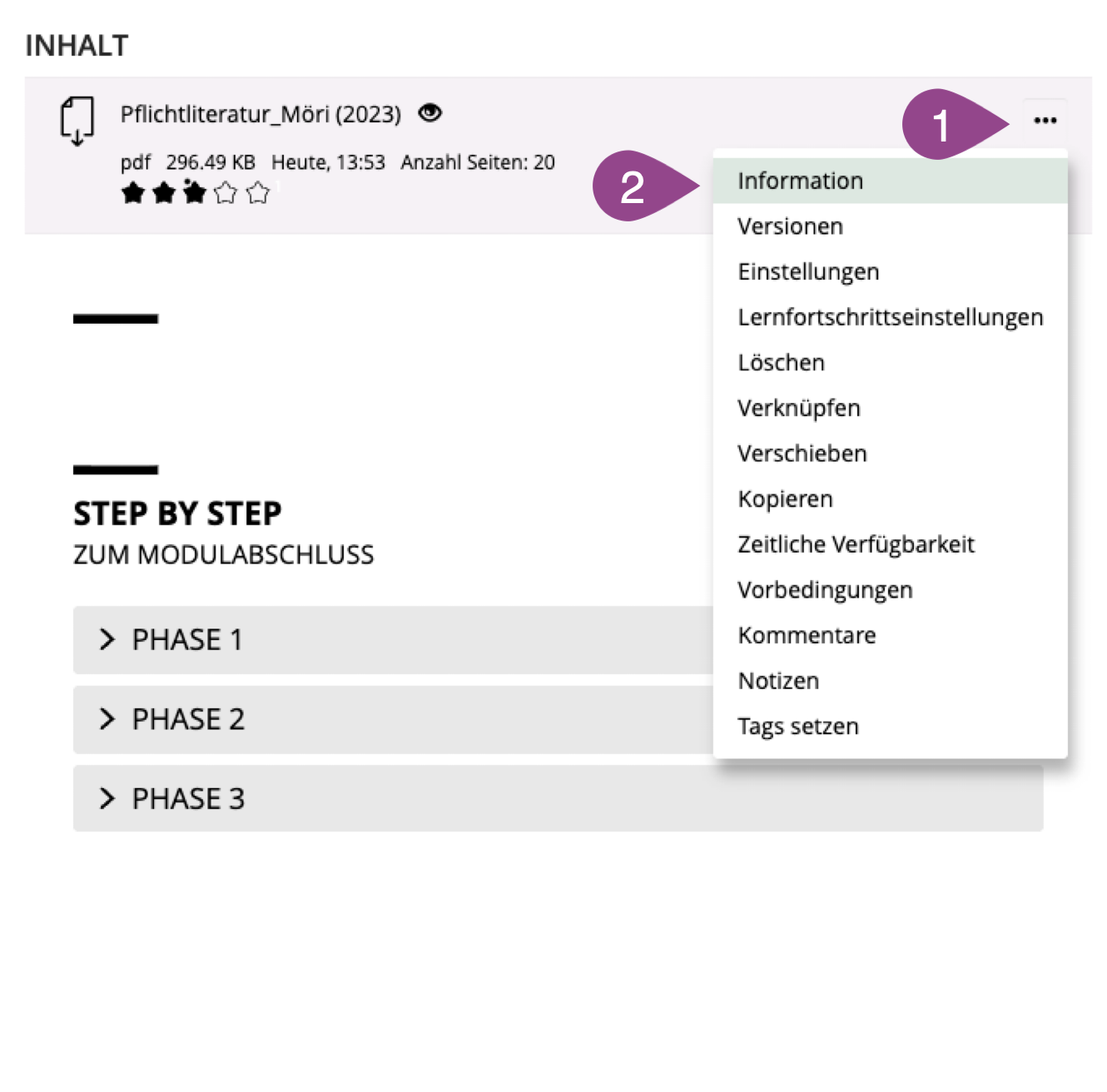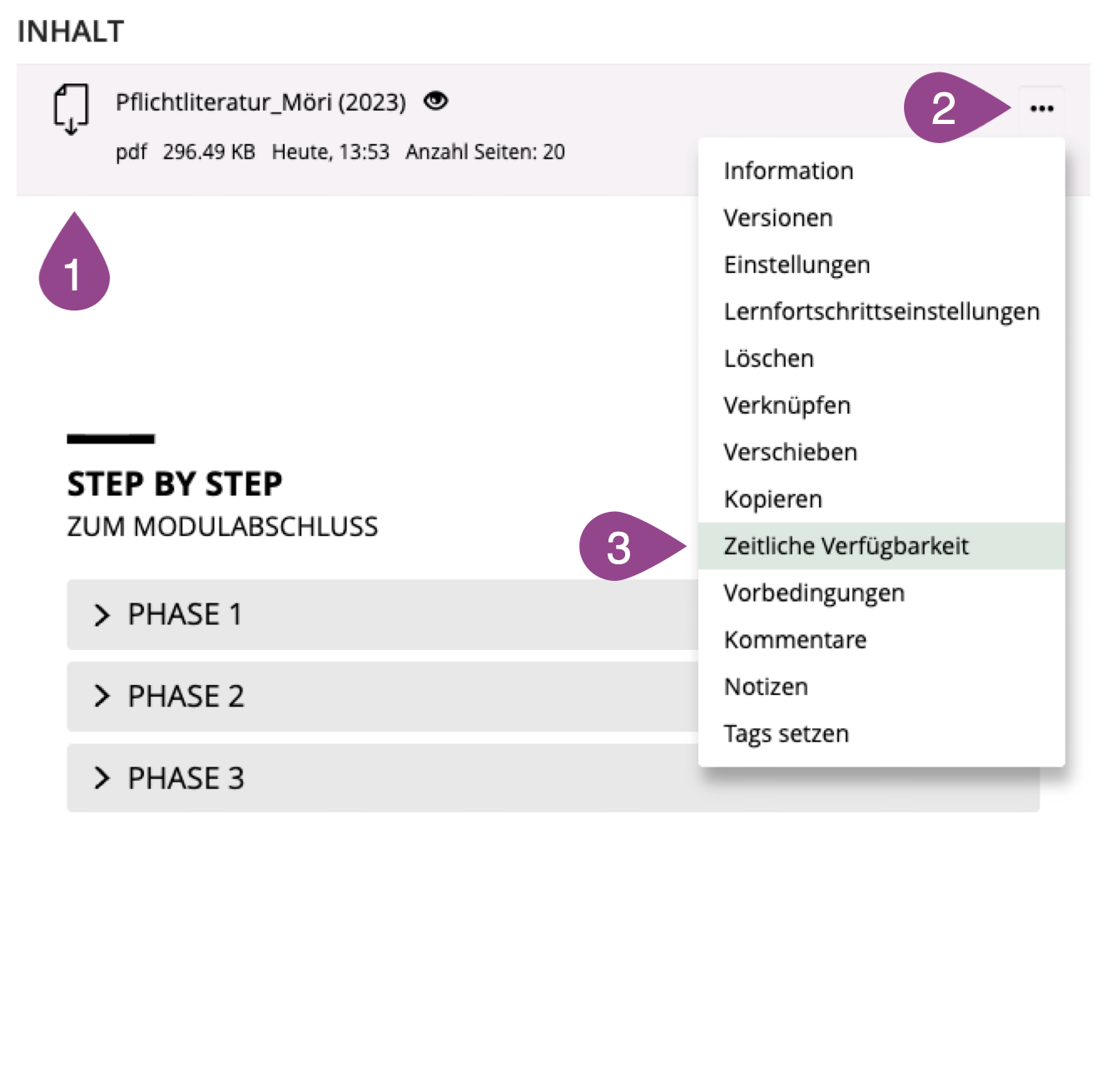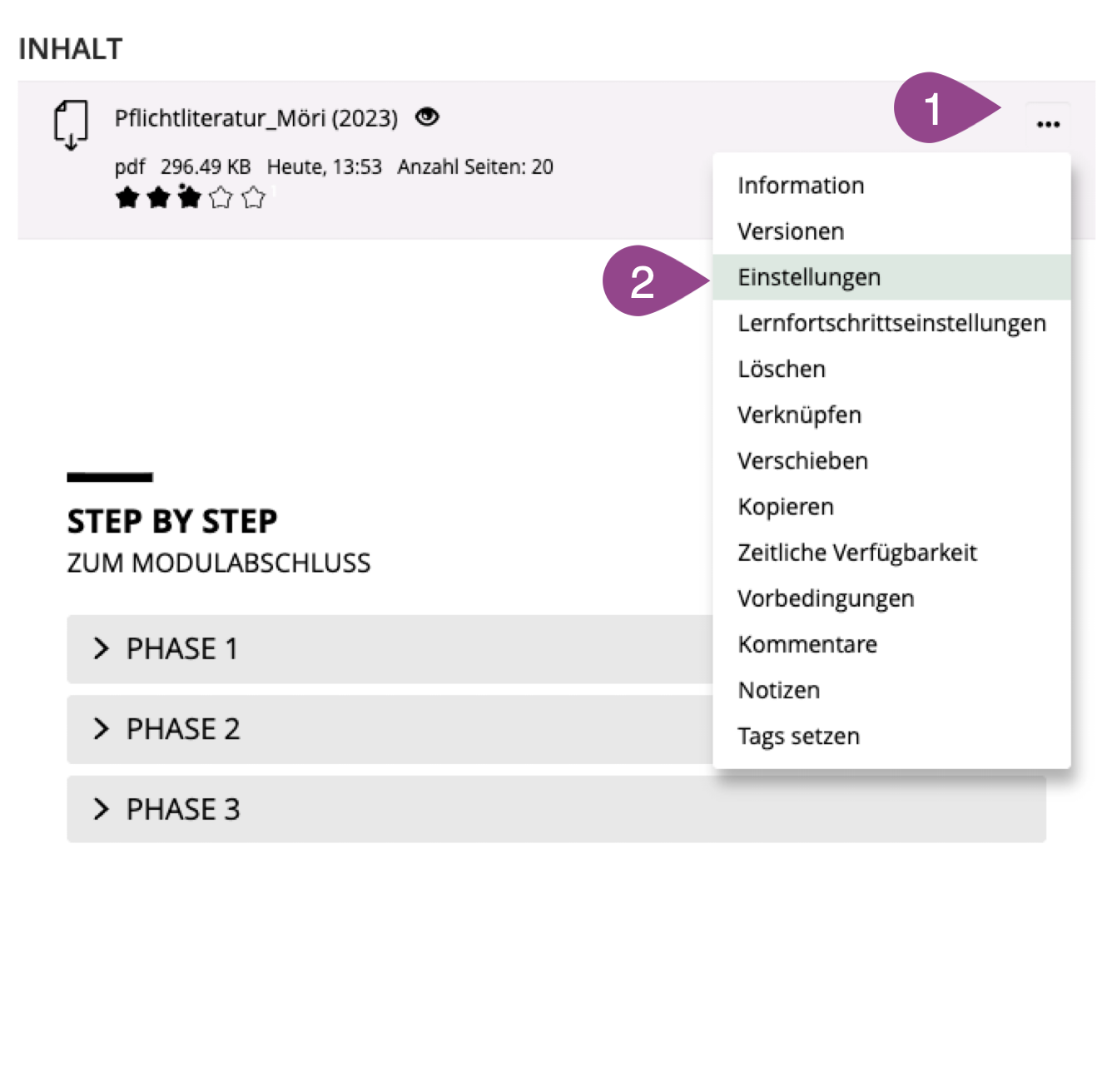 Sobald Sie sich in einem Kurs (oder Ordner oder Gruppe) befinden und die entsprechenden Administratoren-Rechte besitzen, können Sie eine «Datei» anlegen und hochladen. Gehen Sie dazu wie folgt vor: