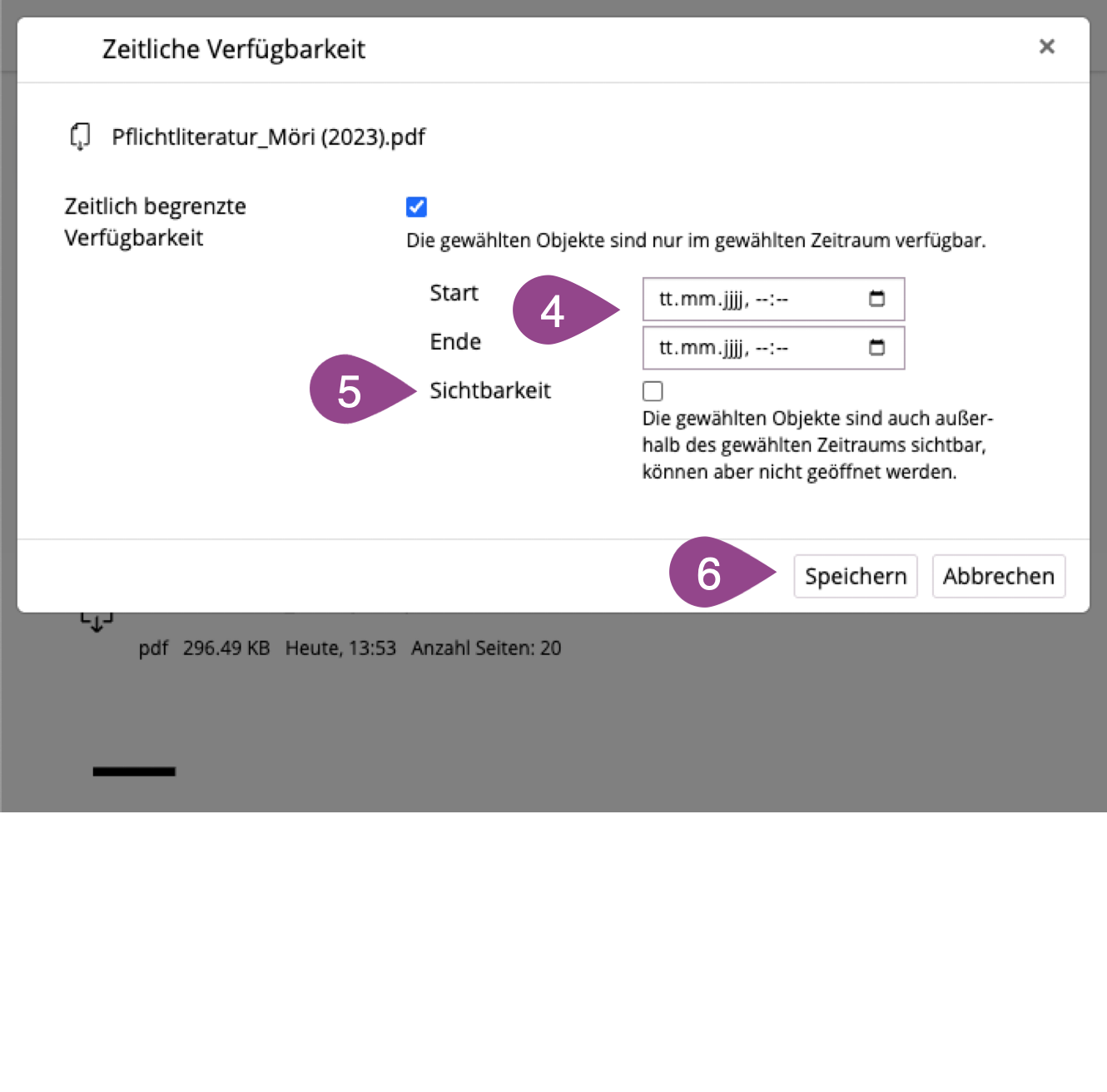 Aktivieren Sie die Option «Zeitlich begrenzt verfügbar» und geben Sie den Zeitraum ein, in dem die Datei aufgerufen werden können soll. | |