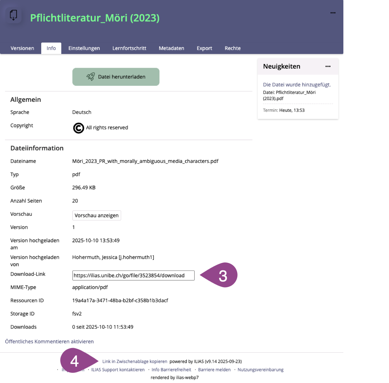In der Fusszeile finden Sie die Option «Link in Zwischenablage kopieren». Mit diesem Link wird man auf dieses Register "Info" der Datei weitergeleitet. So erhält man einen besseren Überblick wo sich die Datei in ILIAS befindet und kann die Datei über den Button «Datei herunterladen» downloaden. |