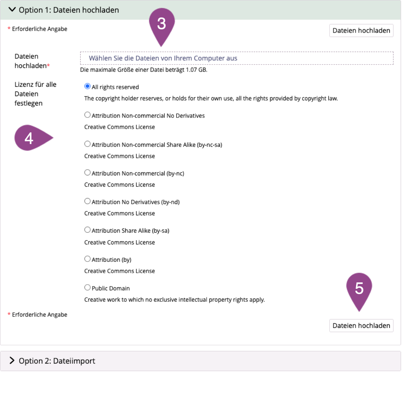 Definieren Sie die «Lizenz für alle Dateien». Die Lizenz definiert den Verwendungszweck dieser Datei(en) und wird den Kursmitglieder als «Copyright» in den Informationen zur Datei ausgewiesen. Besonders bei eigens erstellte Unterlagen, lohnt es sich den genauen Verwendungszweck über die Lizenz zu steuern. Ansonsten empfehlen wir die Standardeinstellung «All rights reserved». Weitere Informationen zum Verwendungszweck von Unterlagen auf ILIAS finden Sie in der Nutzungsvereinbarung. Nutzungsvereinbarung ILIAS | |