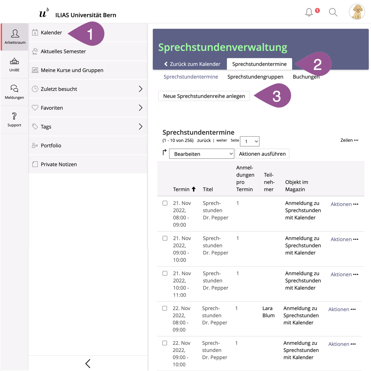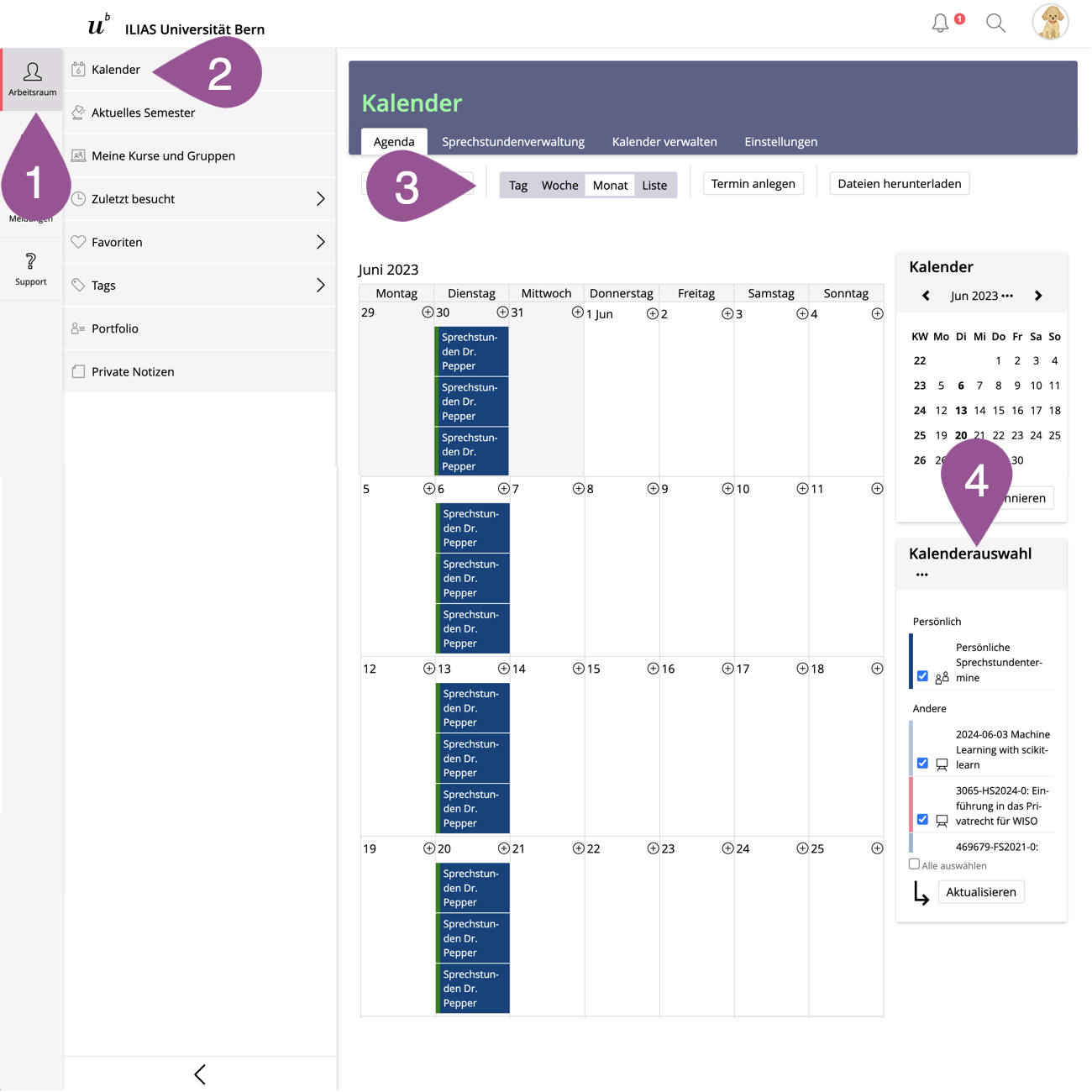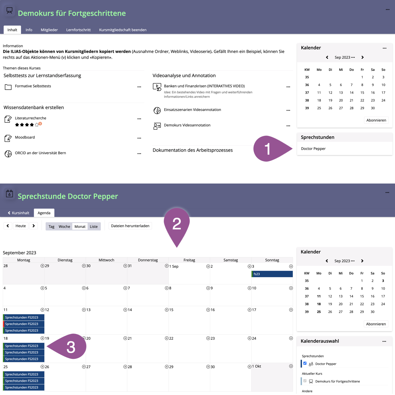 Diese Anleitung informiert darüber, wie Sie die Sprechstunden-Funktion des ILIAS-Kalenders nutzen können, und wie der Kalender in einem externen Kalenderprogramm abonniert werden kann. Informationen zum KSL Kalenderabonnement finden Sie im KSL Handbuch ab S. 482.