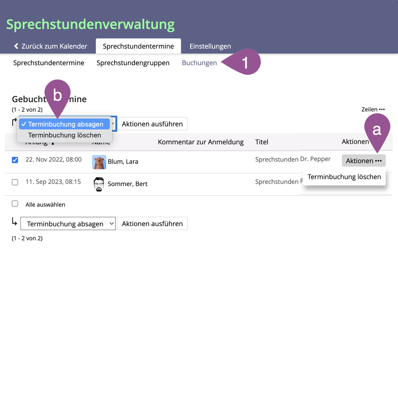 Gehen Sie im Register «Sprechstundentermine» zum Sub-Register «Buchungen». | |||||