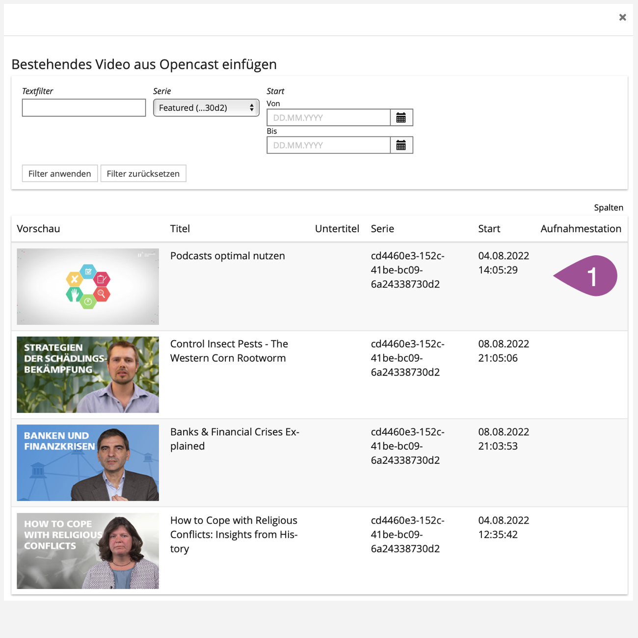 Selektieren Sie das gewünschte Video, indem Sie die entsprechende Zeile per Mausklick auswählen. Nach dem Klick werden Sie unmittelbar in den Reiter «Einstellungen» weitergeleitet. | |
