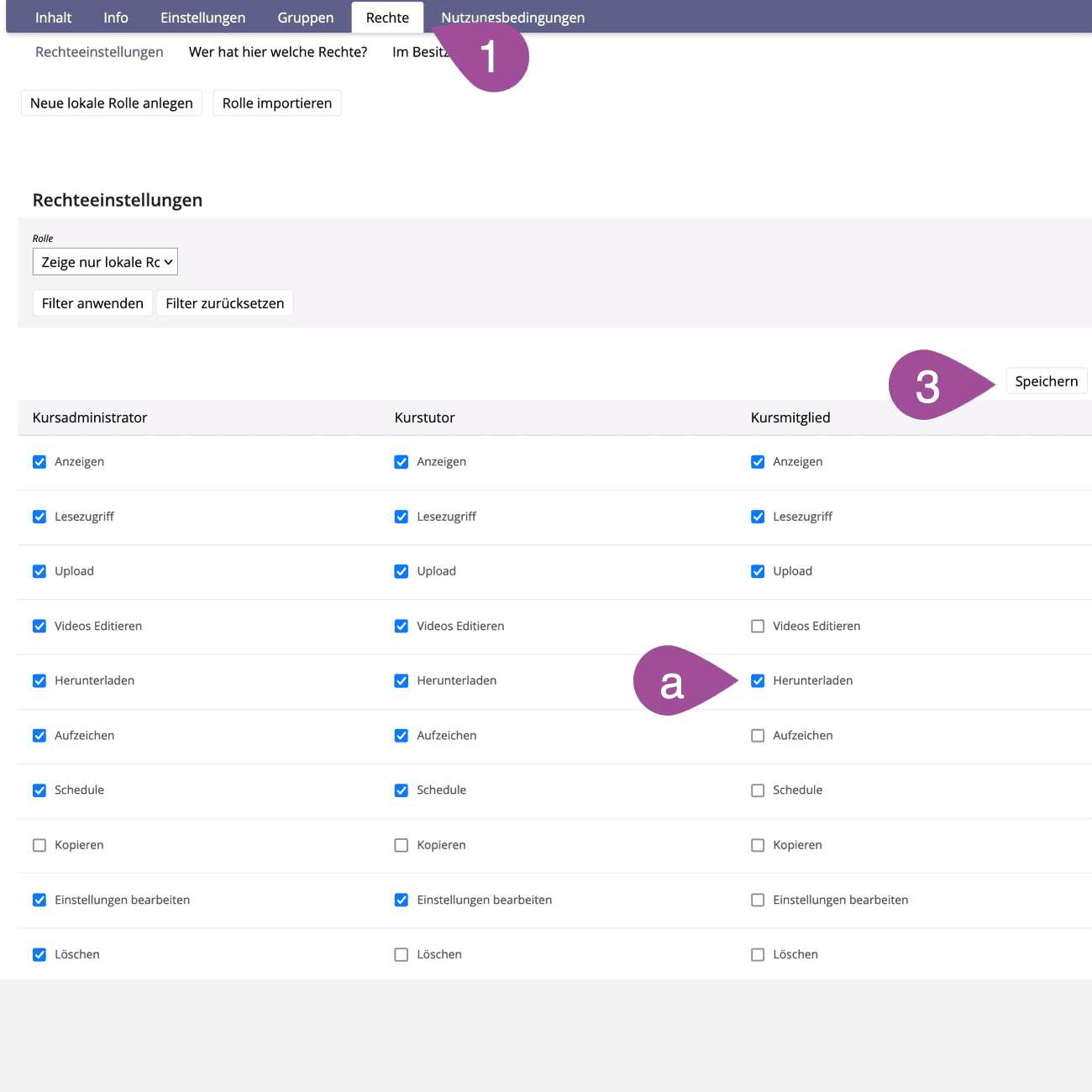 Stellen Sie sicher, dass dort die Option «Herunterladen» in der Spalte «Kursmitglied» aktiviert ist. | |
