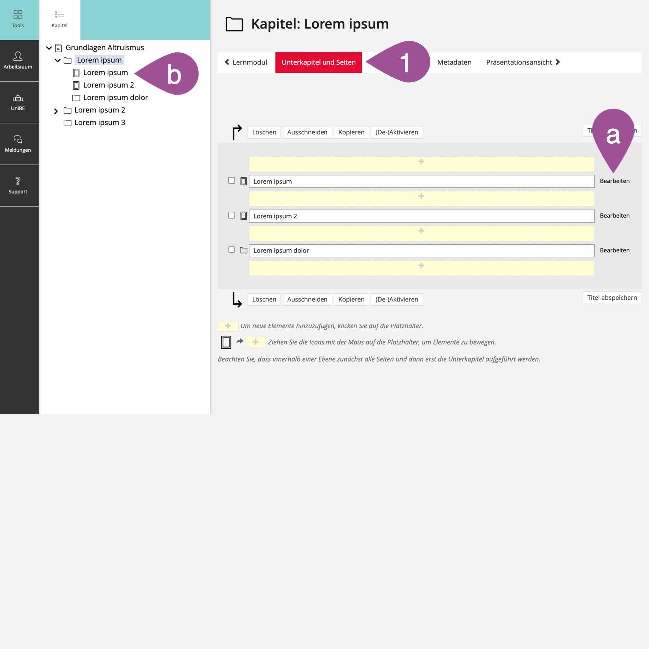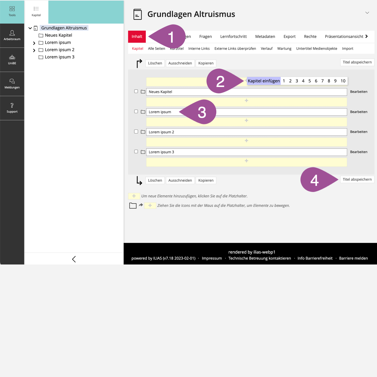 Um Lernmodule mit Inhalten zu füllen, werden zuerst einzelne «Kapitel» angelegt und anschliessend in diesen Kapiteln «Seiten» generiert, auf denen in einem letzten Schritt die Lerninhalte platziert werden. Dabei ist zu beachten, dass für Studierende nur jene Seiten zugänglich sind, die auch einem Kapitel zugeordnet sind.