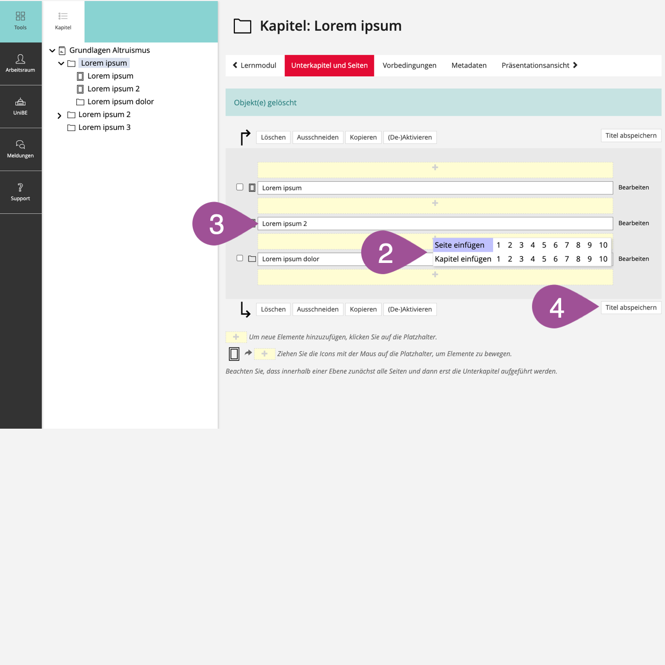 Geben Sie jedem Unterkapitel und jeder Seite einen «Titel». Ob dieser Titel im Lernmodul angezeigt wird, richtet sich nach den Einstellungen des Lernmoduls (siehe 3. Einstellungen anpassen). | |||||