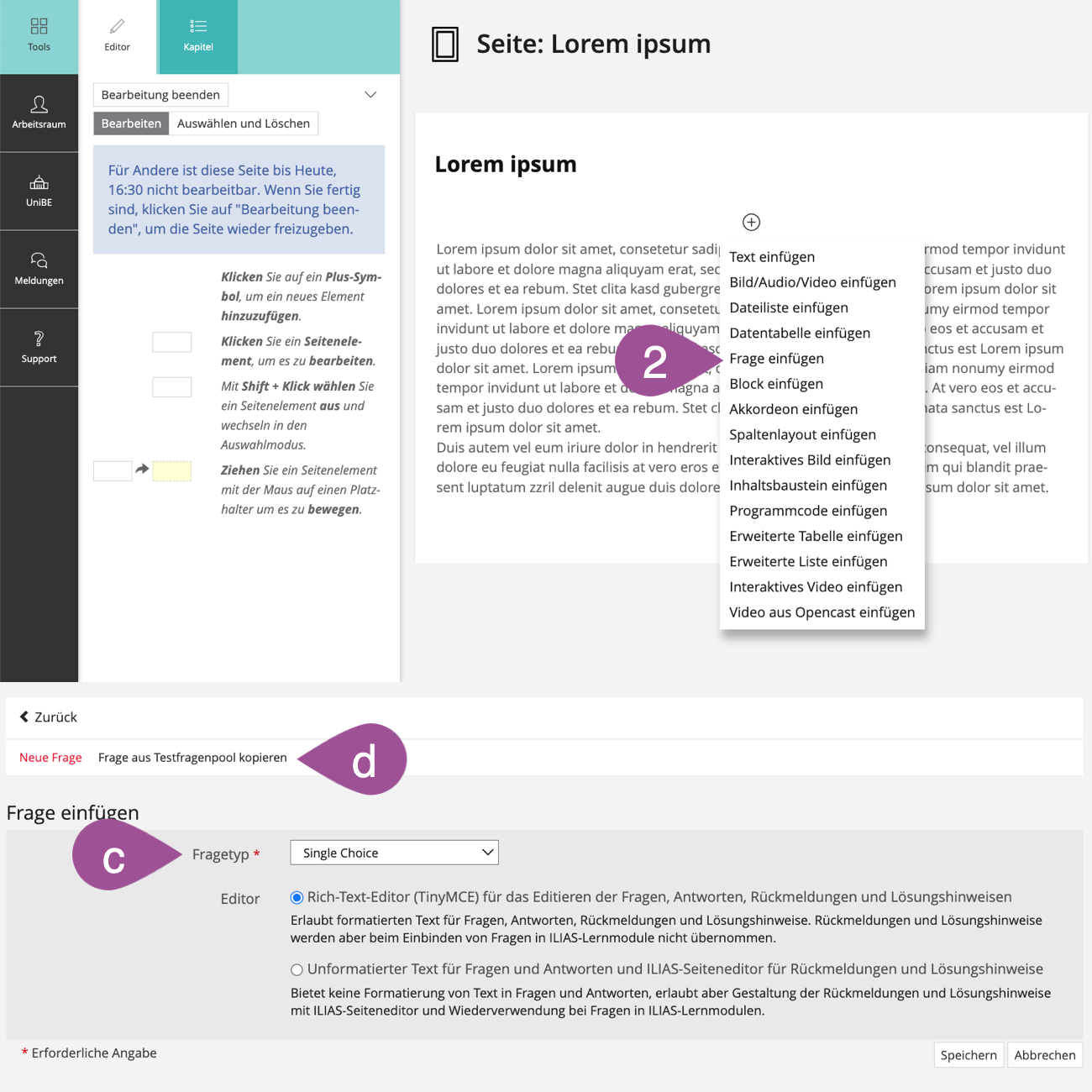 Lerninhalte werden innerhalb einer Seite im Register «Unterkapitel und Seiten» angelegt. Sie haben zwei Möglichkeiten: