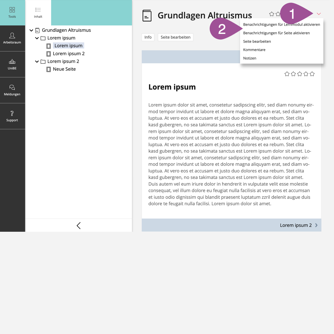Wählen Sie ob Sie Benachrichtigungen nur für die aktuelle Seite, oder für das gesamte Lernmodul (de-)aktivieren möchten. |