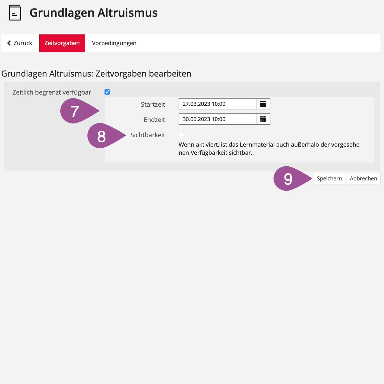 Sie können einstellen, in welchem Zeitraum auf das Lernmodul zugegriffen werden kann. Ausserhalb dieses Zeitraums kann das Lernmodul nicht aufgerufen werden.