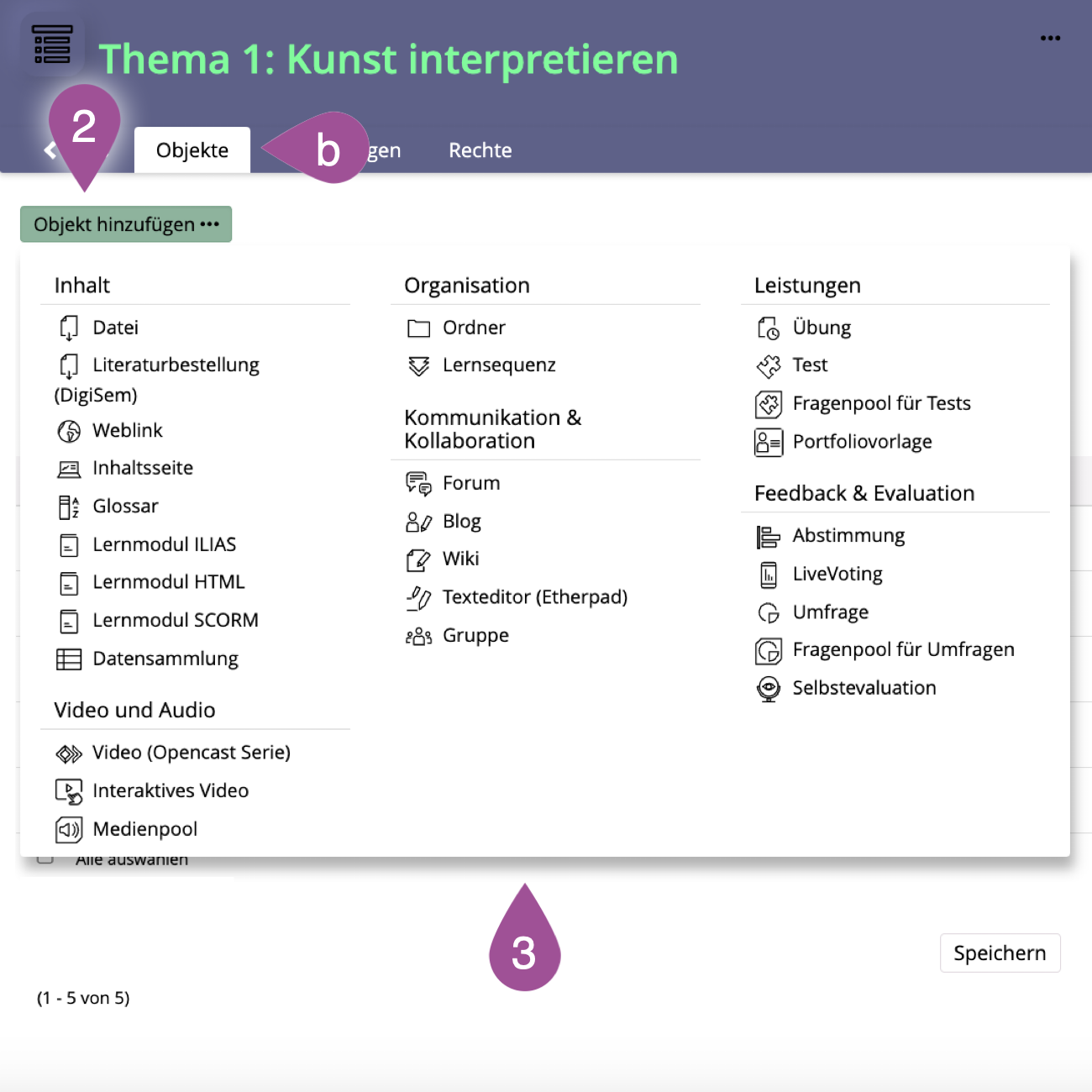 Um den Objekteblock anzusehen, klicken Sie oben links zurück auf das umliegende Objekt (hier z.B. «Kurs»). |