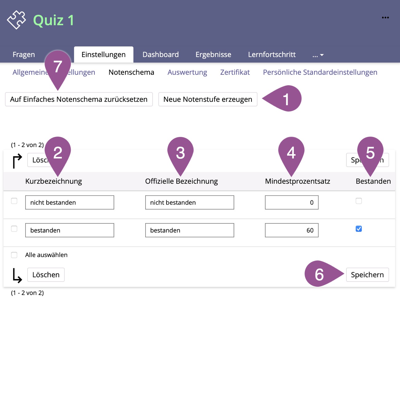 Geben Sie den «Mindestprozentsatz» an, der zum Erreichen der Notenstufe nötig ist. | |