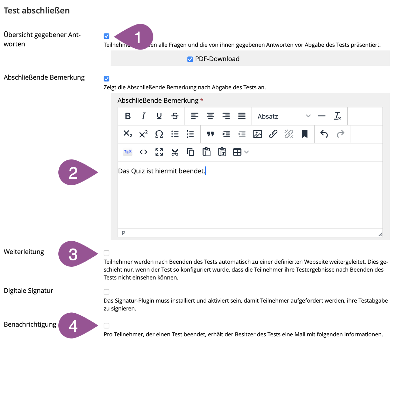 Sie können eine abschliessende Bemerkung eingeben, die den Teilnehmenden nach der Beendigung des Tests angezeigt wird. | |