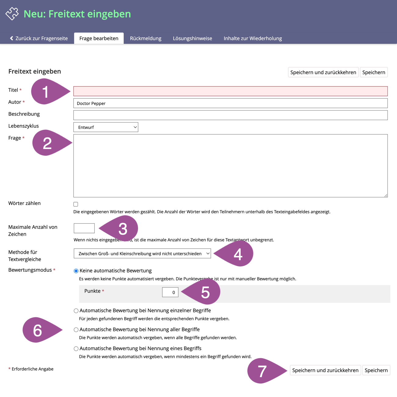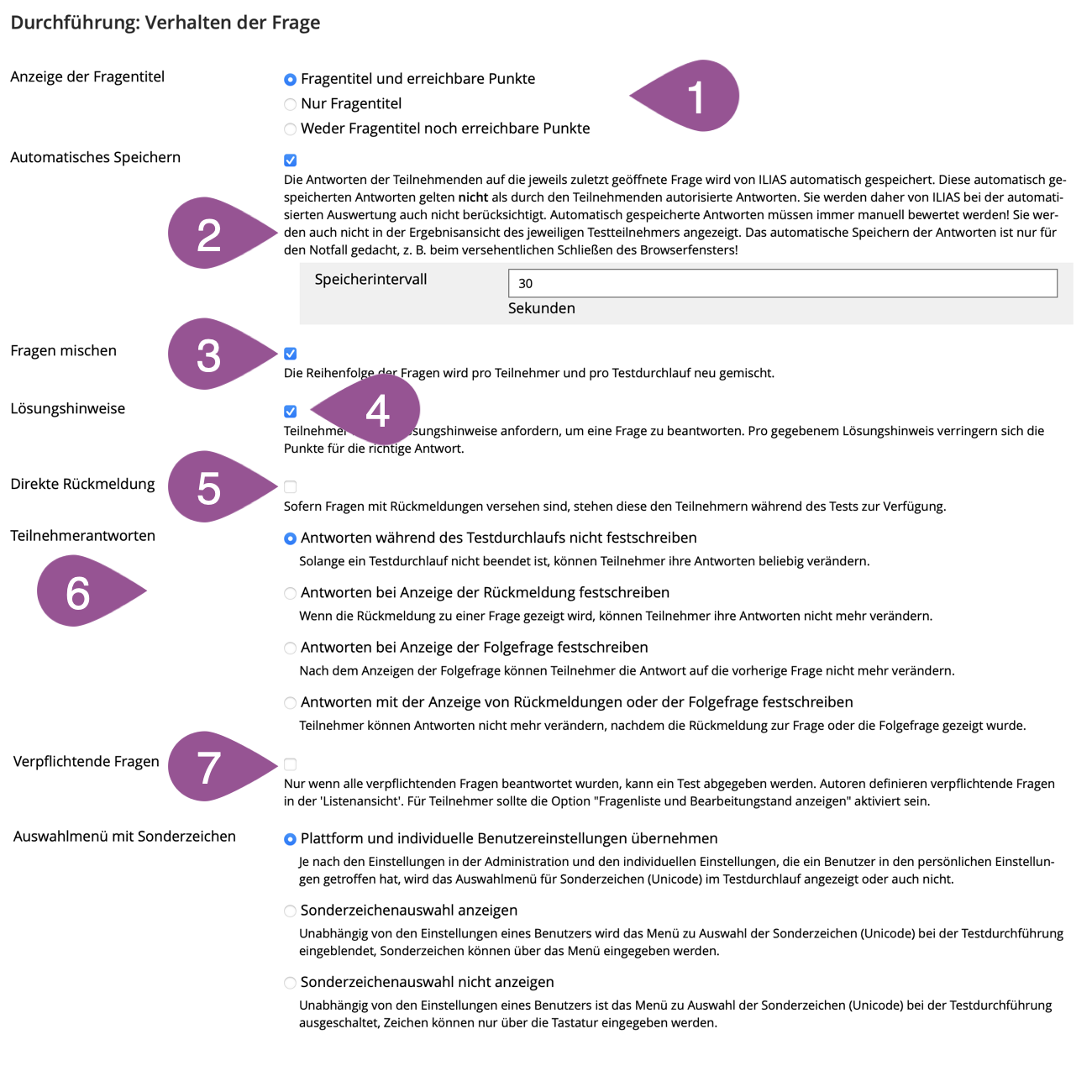 Sie können festlegen, ob und in welchen Intervallen Antworten automatisch zwischengespeichert werden sollen. Beachten Sie, dass das automatische Speichern der Antworten nur für den Notfall gedacht, z. B. beim versehentlichen Schließen des Browserfensters. Diese automatisch gespeicherten Antworten werden von ILIAS bei der automatisierten Auswertung nicht berücksichtigt und müssen immer manuell bewertet werden (siehe 6.1 Manuelle Bewertung). | |