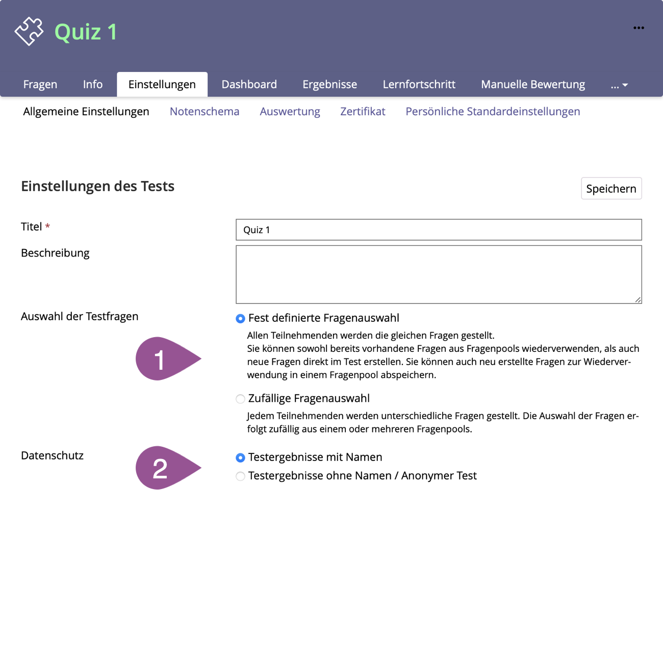 Sie können den Test zu Probezwecken durchführen, müssen dann aber Ihre Testdatensätze wieder löschen (siehe «Ergebnisse»), bevor Sie Fragen weiterbearbeiten und einzelne Einstellungen verändern können.