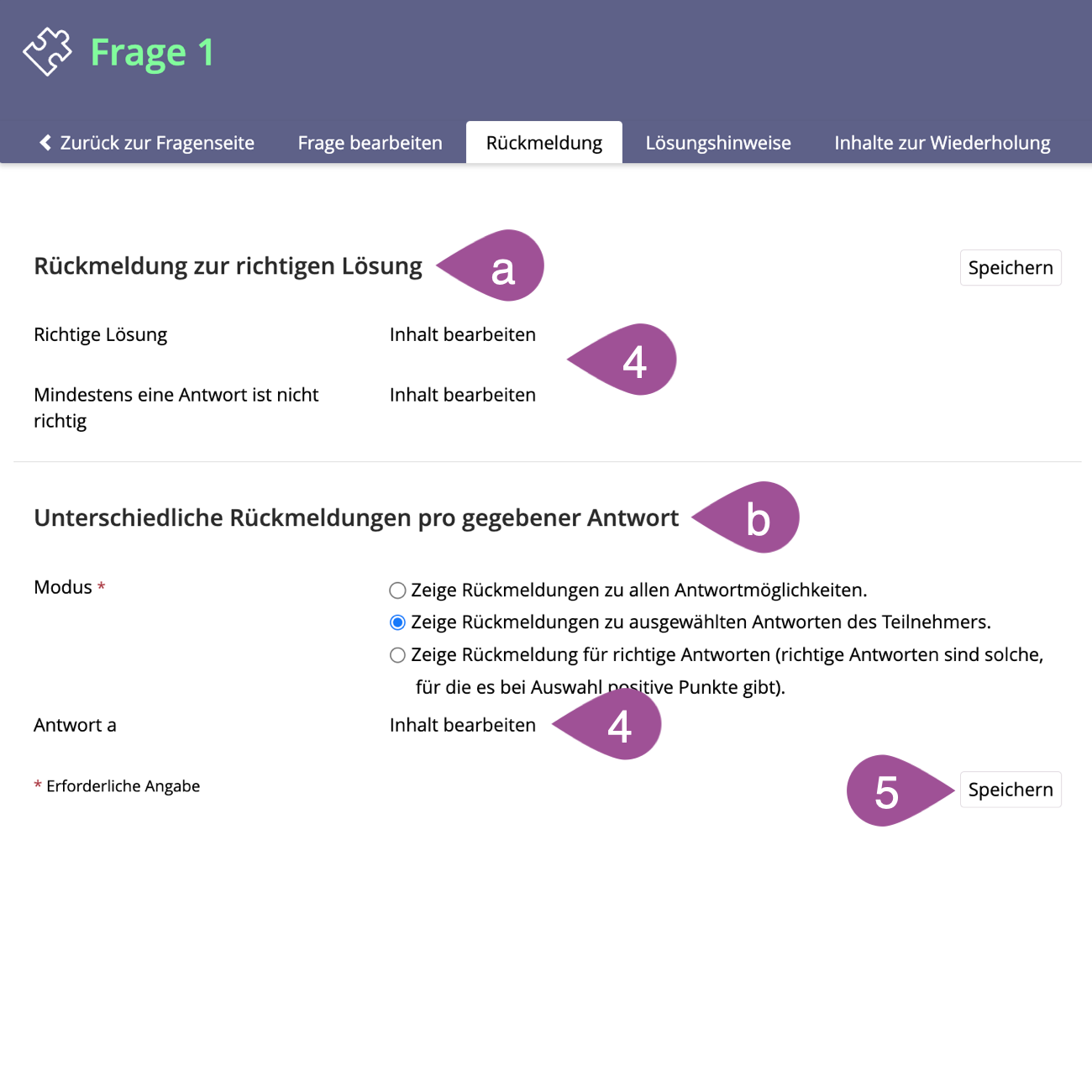 Sie können jeder Frage eine Rückmeldung hinzufügen. Je nach Einstellungen können die Rückmeldung von Teilnehmenden sofort beim Beantworten einer Frage aufgerufen werden (siehe 3.1 Allgemeine Einstellungen) oder nach Beendigung des Tests eingesehen werden (siehe 3.3 Auswertung).
