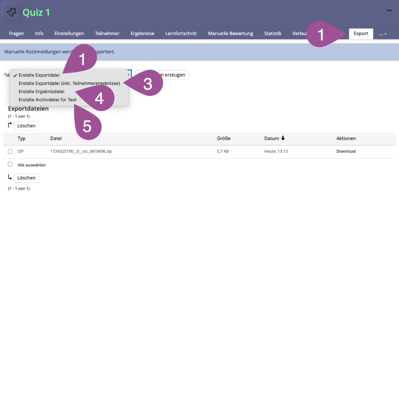 Die Funktion «Erstelle Exportdatei» können Sie nutzen, um Ihren Test inkl. Fragen und Einstellungen in Form einer komprimierten ZIP-Datei zu exportieren und auf einer anderen ILIAS-Installation zu importieren. Beachten Sie aber, dass dieser Export keine Antwortdaten der Teilnehmenden enthält. | |