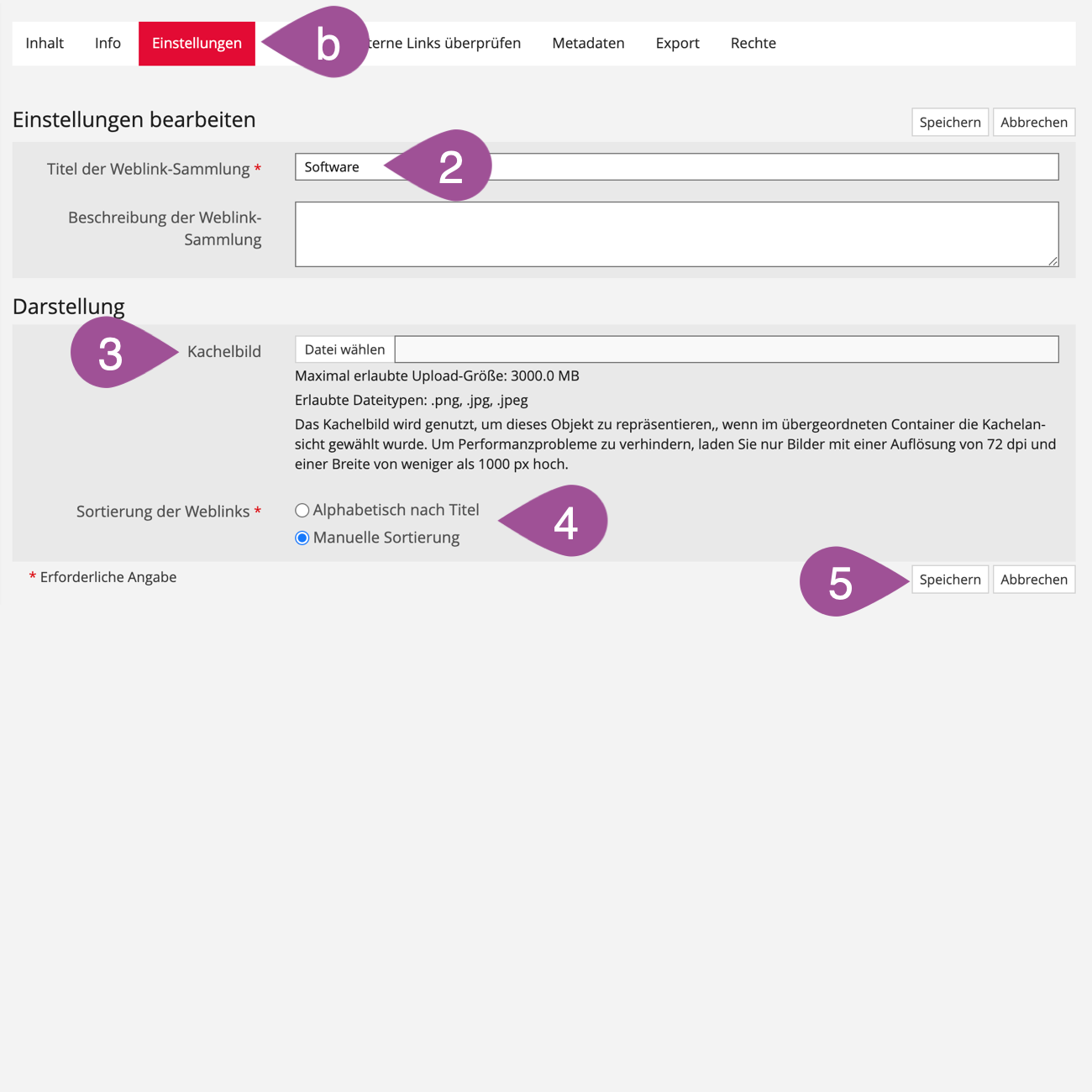Für Linksammlungen können Sie Links in einer Linksammlungen bearbeiten und die Einstellungen der Linksammlung anpassen.