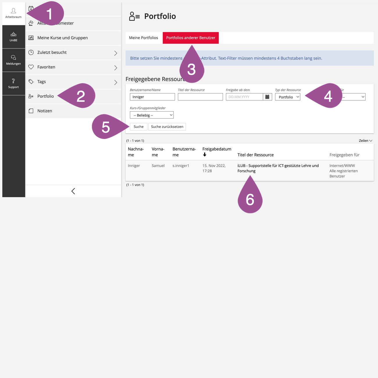 Um die Anzahl der Ergebnisse einzuschränken, geben Sie eine Ihnen bekannte Information zum Portfolio ein, z.B. «Anmeldename/Name» des Besitzers. Ist Ihnen keine Information bekannt, überspringen Sie diesen Schritt. In diesem Fall werden Ihnen alle für Sie freigegebenen Portfolios angezeigt. | |