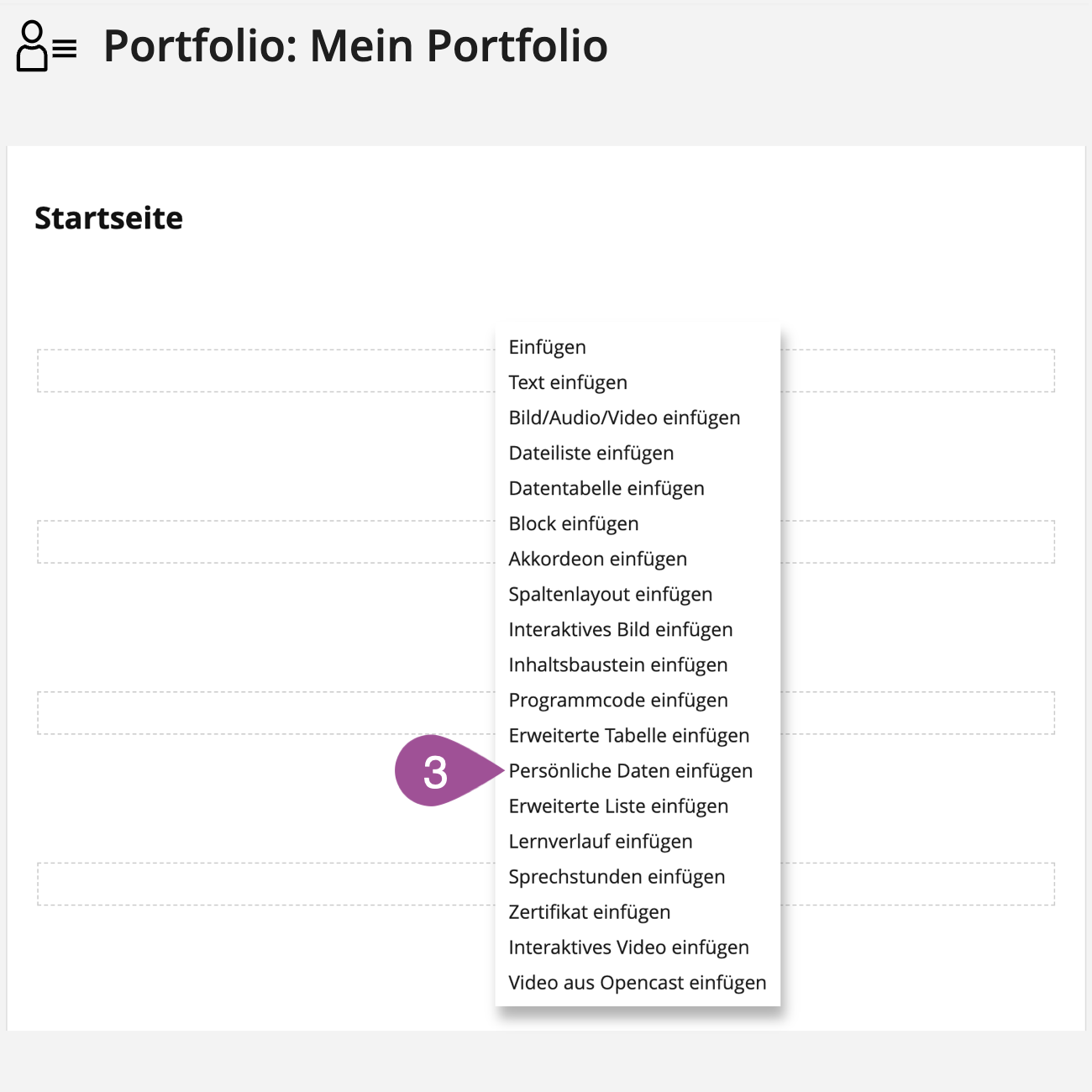 Wenn Sie Ihr Portfolio als ILIAS Profil nutzen möchten (siehe 5.6 Portfolio als ILIAS Profil nutzen), können Sie über die Option «Persönliche Daten einfügen» die Daten einfügen, die Sie in Ihrem Profil hinterlegt haben (siehe Anleitung: ILIAS 1x1).