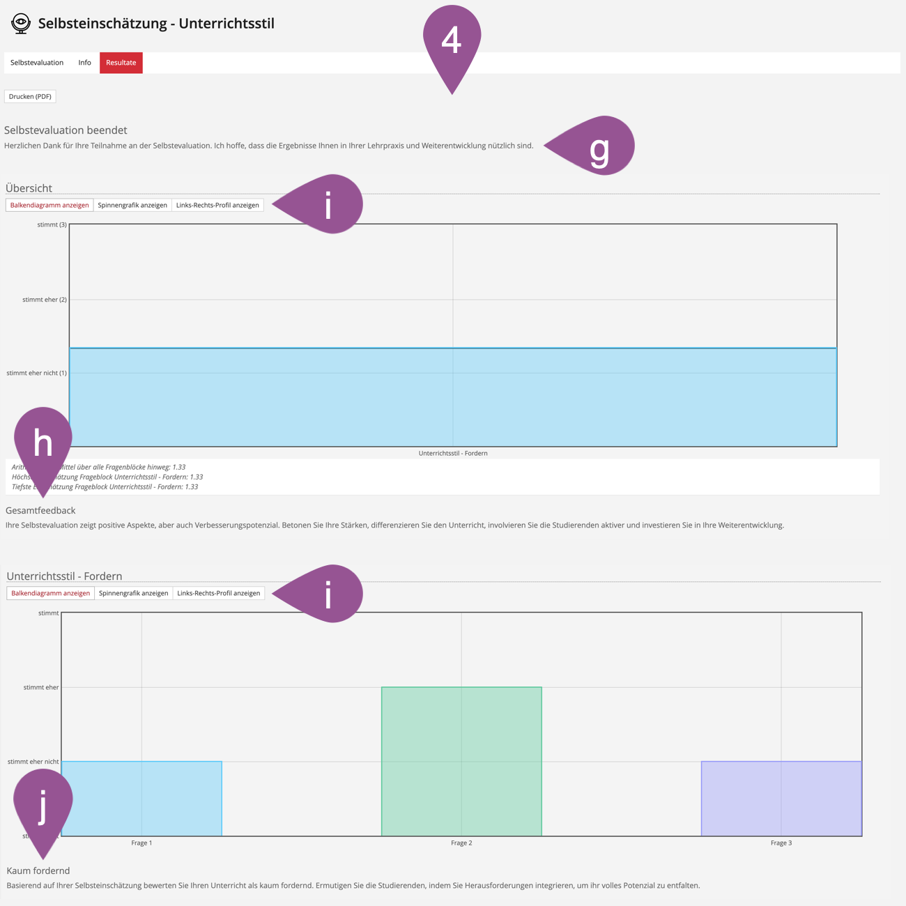 Wichtig bei der Selbstevaluation ist, dass die Teilnehmenden nicht wie bei einer Umfrage oder einem Test üblich, einfach nur Fragen beantworten, sondern, dass diese am Schluss auch ein Feedback in Bezug auf ihre Antworten in den einzelnen Blöcken erhalten.