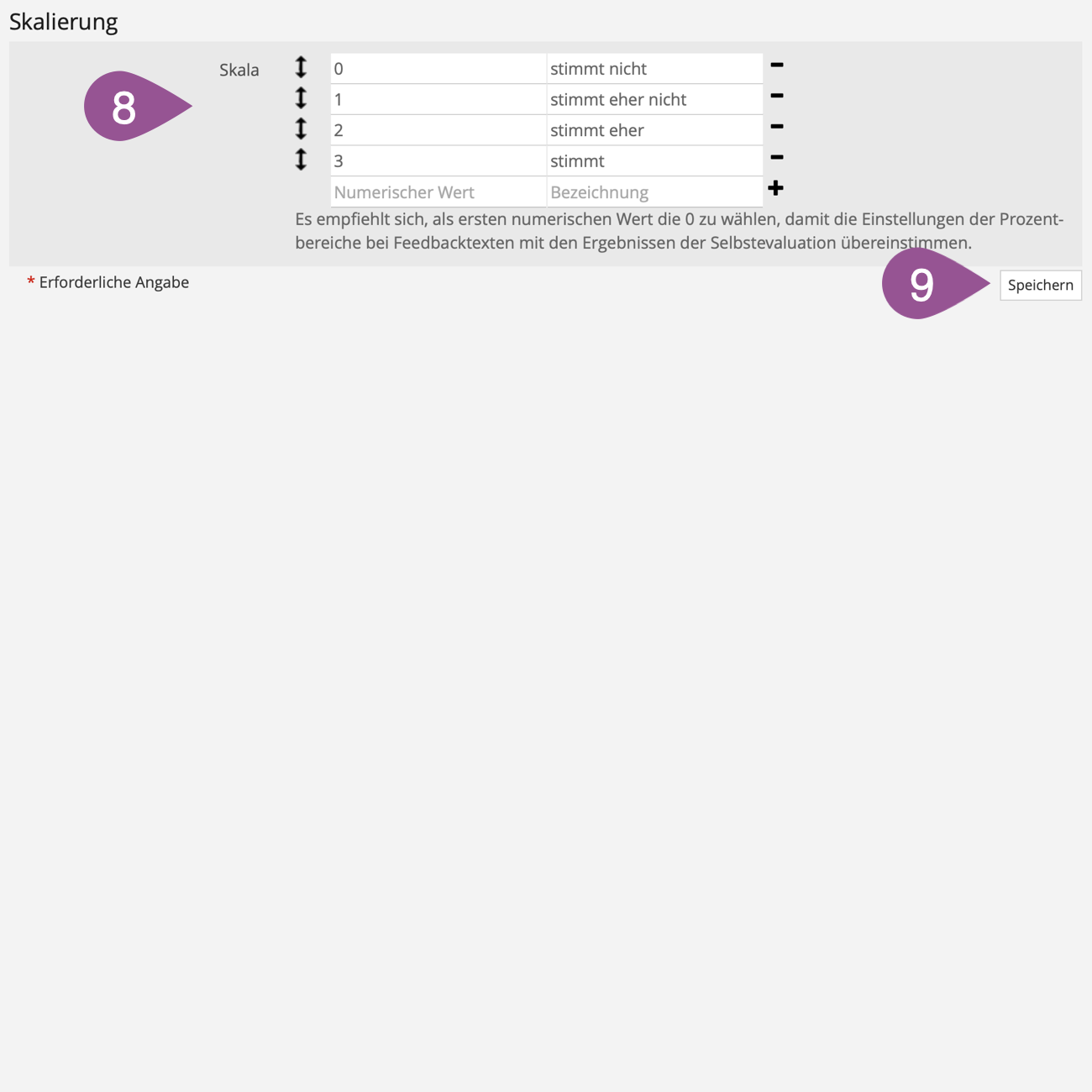 Geben Sie die Bewertungsskala zur Beantwortung aller Fragen, die Sie erfassen werden (siehe 3. Frageblöcke, Stammdatenblöcke & Fragen hinzufügen), ein. Beginnen Sie die Skalierung (Numerischer Wert) mit 0 und nicht wie oft üblich mit 1. Das später erfolgende Feedback (Prozentbereiche) erfolgt damit korrekt. | |