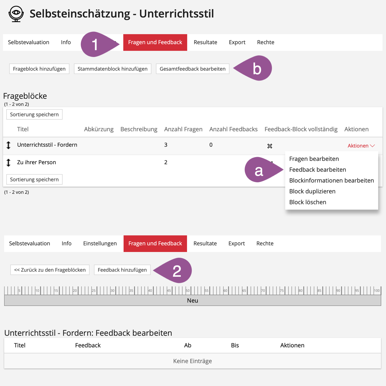 Es muss mindestens ein Feedback für Frageblocks hinterlegt werden. Optional können Sie zusätzlich ein Gesamtfeedback geben. Das Gesamtfeedback bezieht sich auf das Gesamtergebnis und wird in der Auswertung zuoberst unter der «Übersicht» angezeigt. Das Feedback zum Frageblock bezieht sich nur auf den jeweiligen Block und wird in der Auswertung jeweils unter dem Frageblock angezeigt.