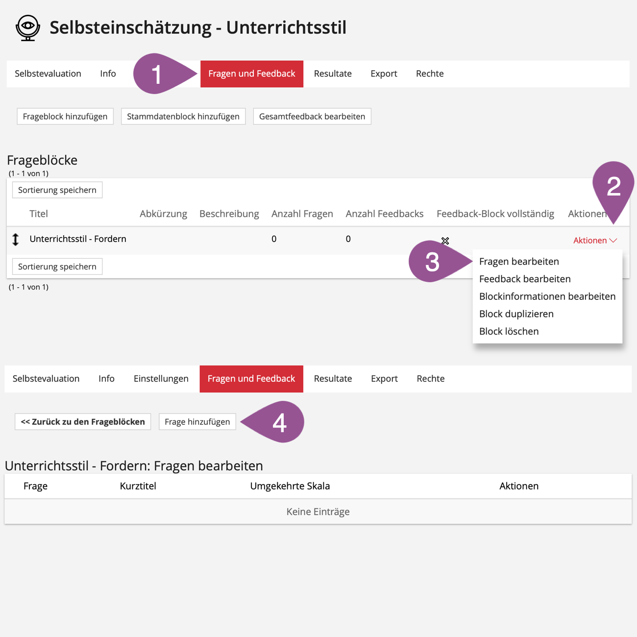 Bevor Sie der Selbstevaluation Fragen hinzufügen können, müssen Sie mindestens einen Frageblock oder einen Stammdatenblock definieren. Anschliessend können Sie in diesem Ihre Fragen in den Frageblock bzw. in den Stammblock einfügen.