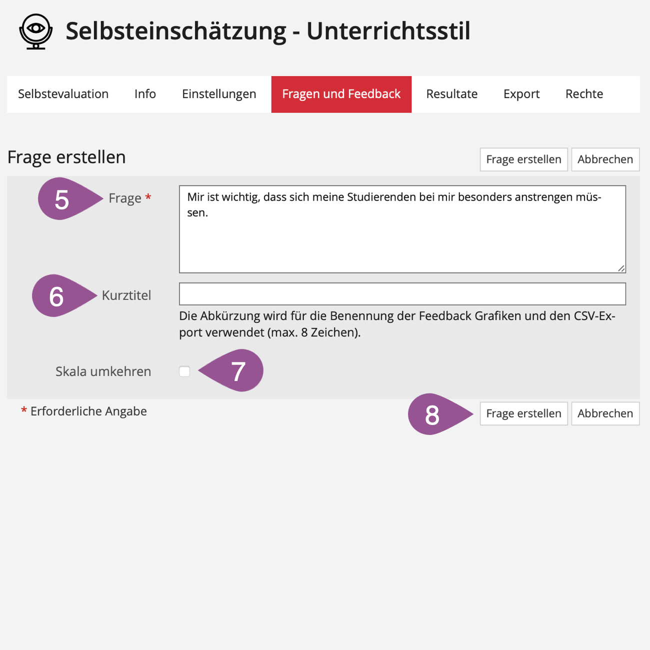 Geben Sie der Frage einen Kurztitel. Der Kurztitel wird für Feedback-Grafiken und CSV-Export verwendet. | |