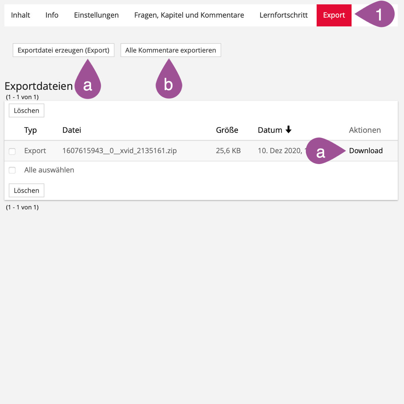«Create Export File (Export)»: Generates a downloadable zip file. This file can be used to import the interactive video elsewhere.