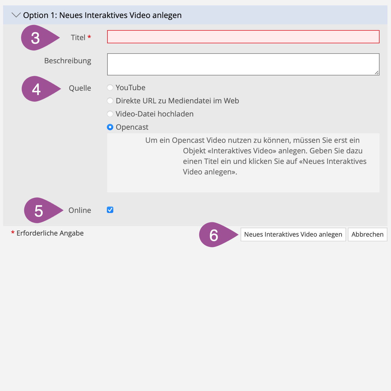 If you selected the source «Opencast» when creating the object, a search mask will be displayed after clicking «Add Interactive Video».