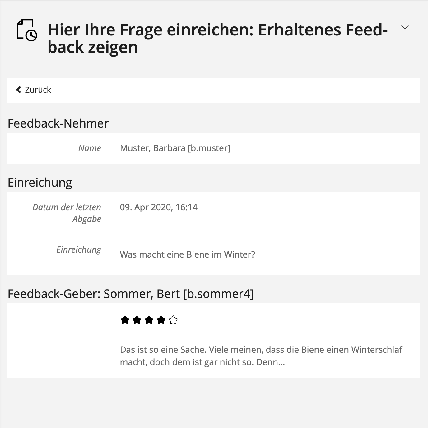 - After the deadline for peer feedback, students can view the feedback they received on their exercise if they have submitted feedback themselves.