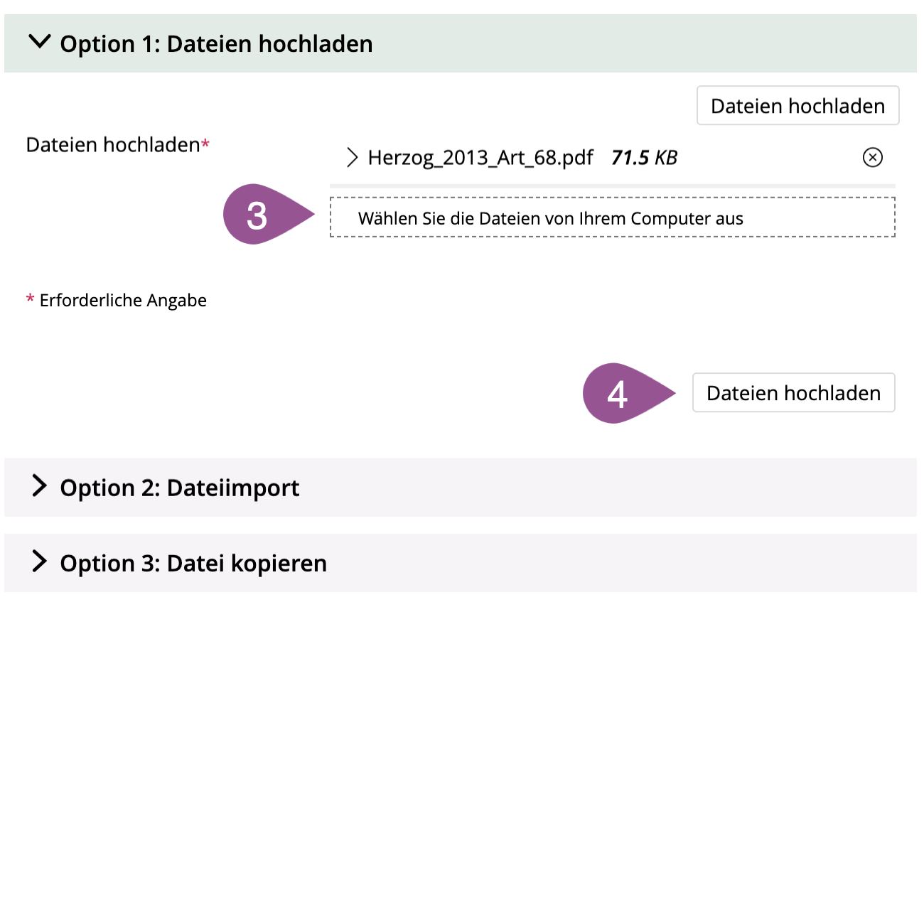 Drag and drop the relevant file(s) into the framed area or click «Select the files from your computer» und and then select the relevant file(s). | |