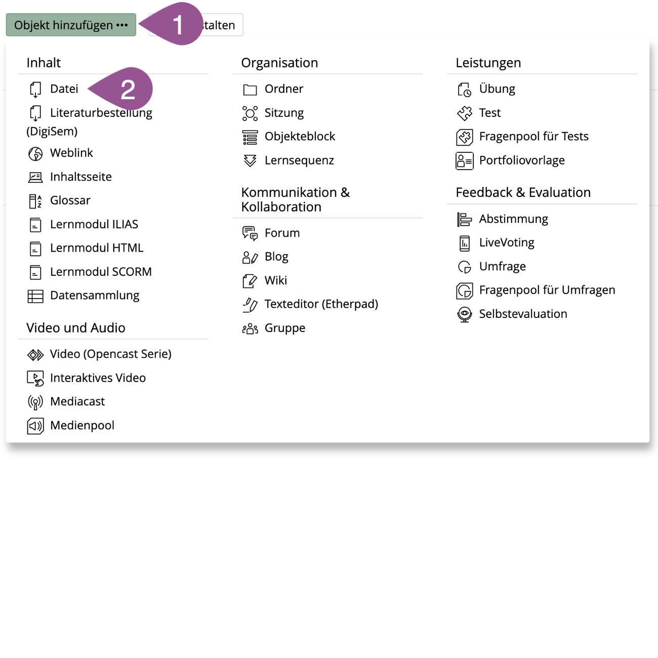 If you have an ILIAS course (or folder, or group) and the appropriate administrative permissions, you can create and upload a «File». Follow the steps below to do so: