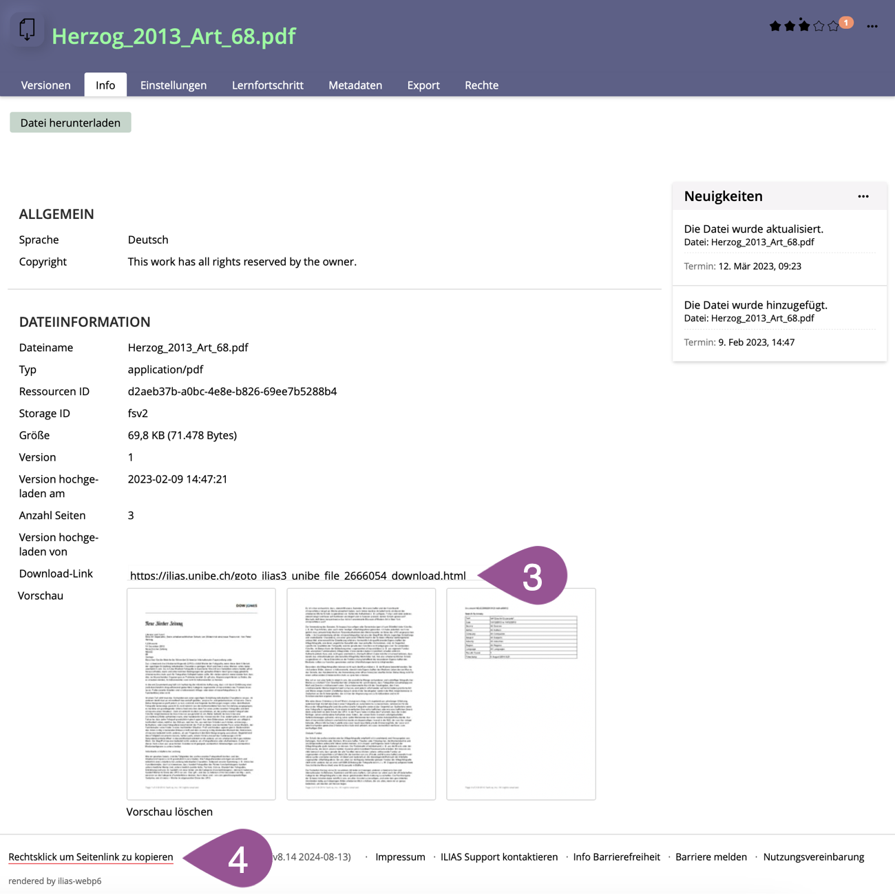Above the preview, you will find the «Download Link». Share the «Download Link» if you want the file to be downloaded directly when clicking on the link (login into ILIAS is required if the file is in a protected area such as a course). | |