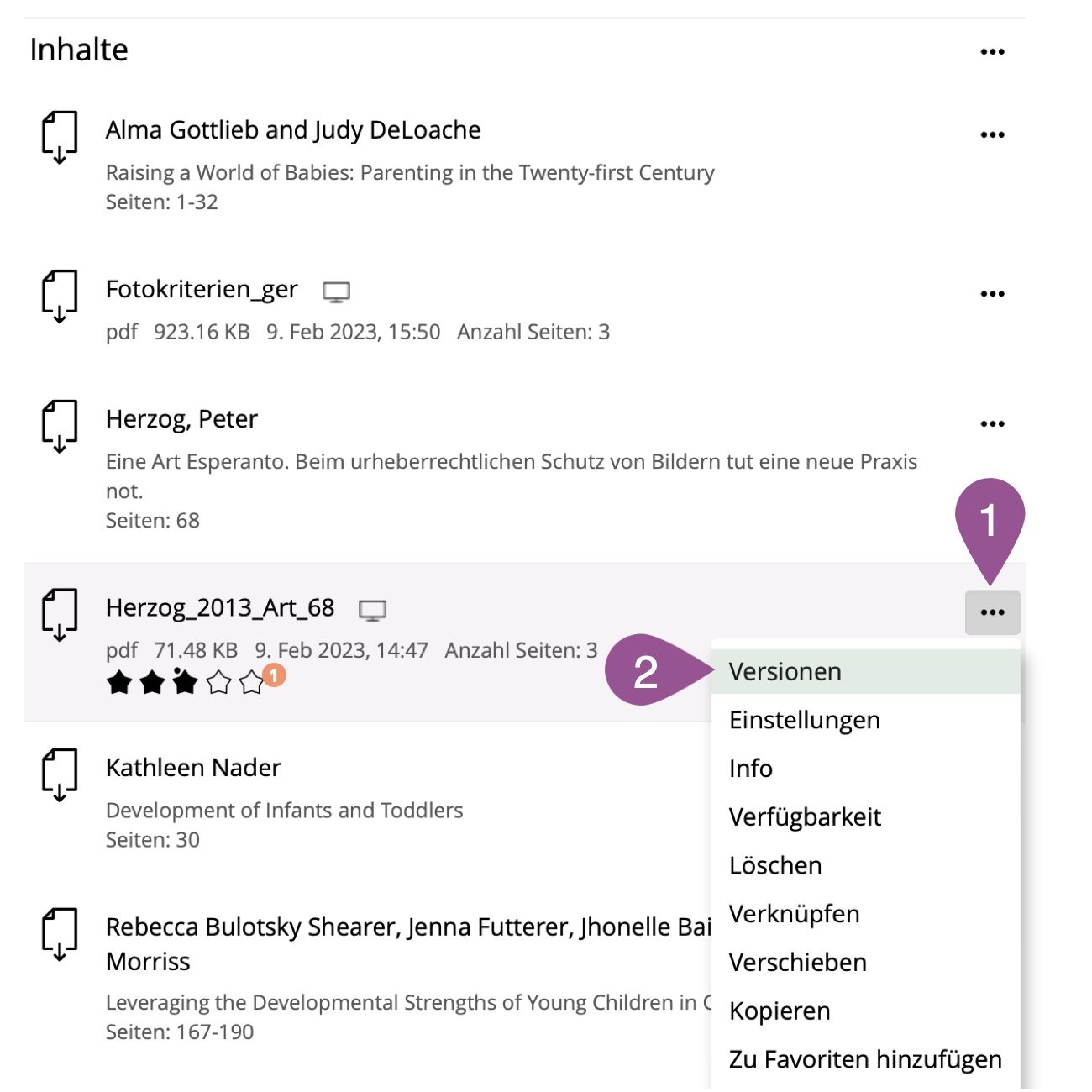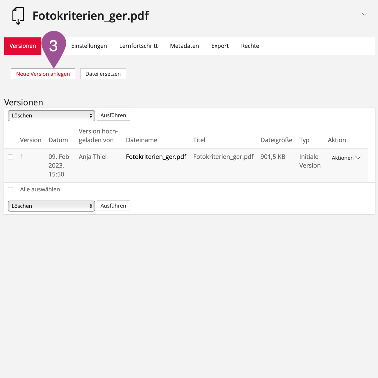 If a file has been updated, you can add the updated version to the existing file on ILIAS. The initial version remains in the background and can be restored if necessary. The access links (siehe 4. File links) also retain their validity for the new version.