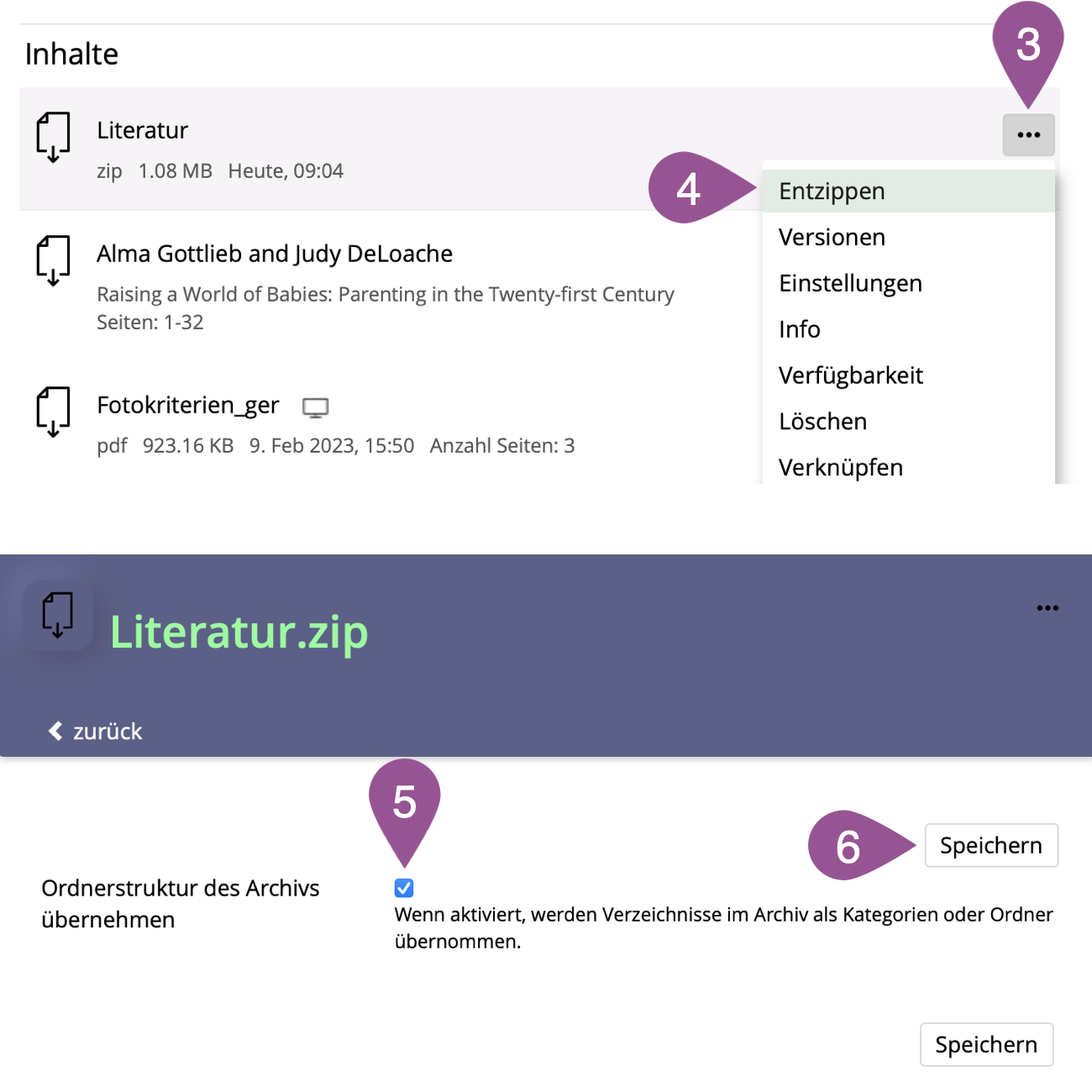 If a ZIP file is uploaded, it will be available to students as a downloadable file. However, you can also use ZIP files to prepare and upload folder structures, including files, and let ILIAS generate ILIAS folders and ILIAS files for viewing and downloading from this ZIP file.