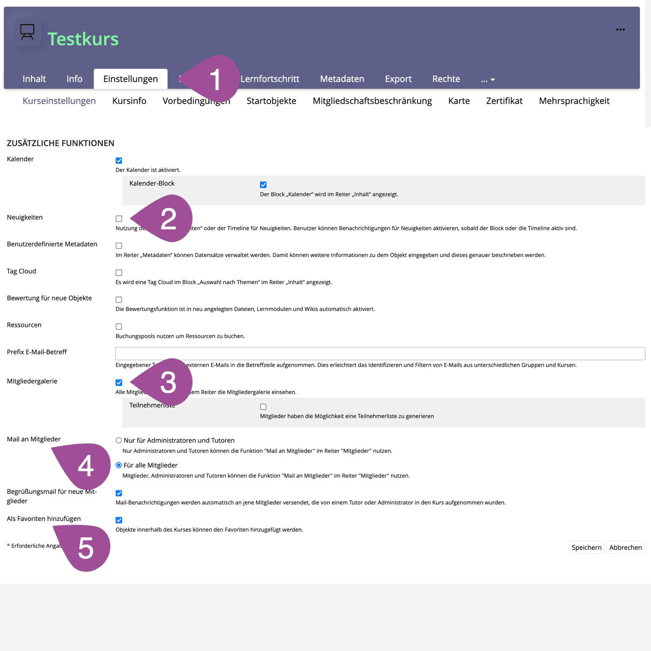Depending on your preferences or the didactic approach of your course, further course settings can be made under «Additional Features»: